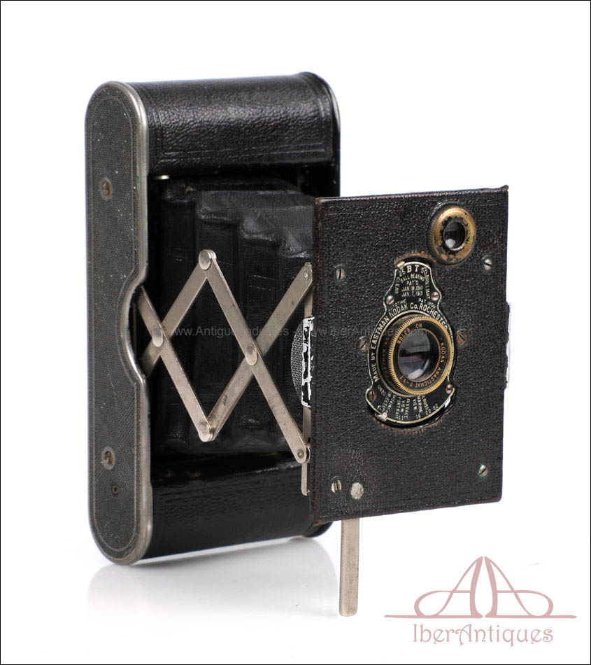 Utiliza película tipo 127, con la que ofrecía negativos de 4x6,5 cm, un tamaño ideal para la fotografía portátil de la época. Equipada con un objetivo Kodak Anastigmat f/7.7 y un obturador Ball Bearing Shutter (patentes de 1910 y 1913), esta pieza reúne la precisión mecánica y la sensibilidad estética que caracterizaron la era dorada de Eastman Kodak. Todo su mecanismo sigue funcionando con fluidez: el obturador acciona correctamente y el fuelle se despliega firme y sin fugas, manteniendo la suavidad original de su estructura metálica.