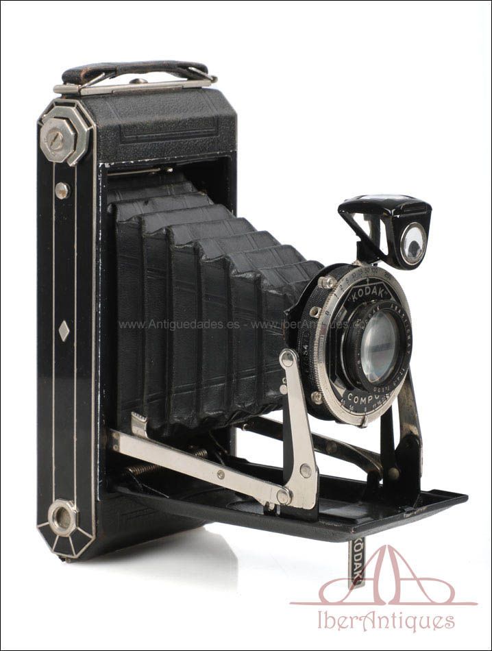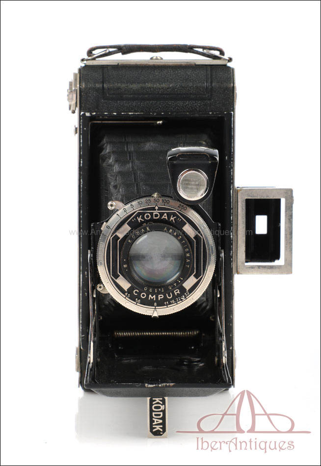 Su versión equipada con obturador Compur y lente Kodak Anastigmat f/4.5 era la más avanzada del modelo, ofreciendo un control de exposición superior y una calidad óptica notable. El conjunto de líneas angulares y detalles metálicos de la carcasa la convierten en un referente de la estética Art Déco aplicada a la tecnología fotográfica.