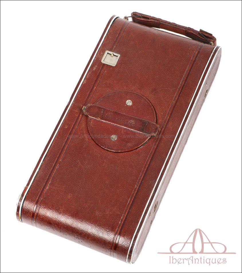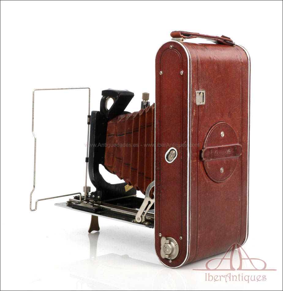 Esta pieza no es solo una cámara fotográfica, sino también un testimonio de la época dorada de la ingeniería alemana. Su imponente tamaño y su acabado en cuero marrón la convierten en un objeto de colección ideal o en un elemento decorativo de gran elegancia. Quedará magnífica en una vitrina o sobre una mesa de estudio, evocando la esencia de la fotografía clásica y el arte mecánico de principios del siglo XX.