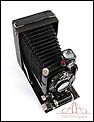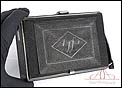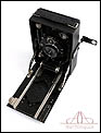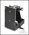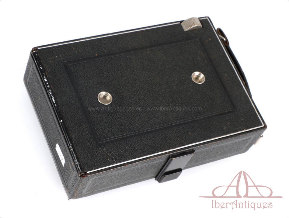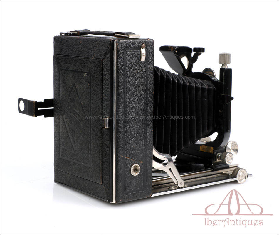Construida sobre un armazón metálico robusto con recubrimientos lacados en negro, presenta herrajes cromados en muy buen estado. El fuelle es original y se conserva flexible y sin fugas de luz. El mecanismo de extensión y plegado se desplaza de forma uniforme gracias a las guías frontales que mantienen la alineación del estándar, lo que facilita el enfoque y permite mantener la posición del objetivo con seguridad. La cámara se acompaña de un chasis original para placas de 9 x 12 cm que aparece bien conservado, lo que refuerza su valor como conjunto funcional y completo. El visor abatible se ve íntegro y mantiene la pantalla de enfoque con su capucha plegable, también en un estado que permite su uso.