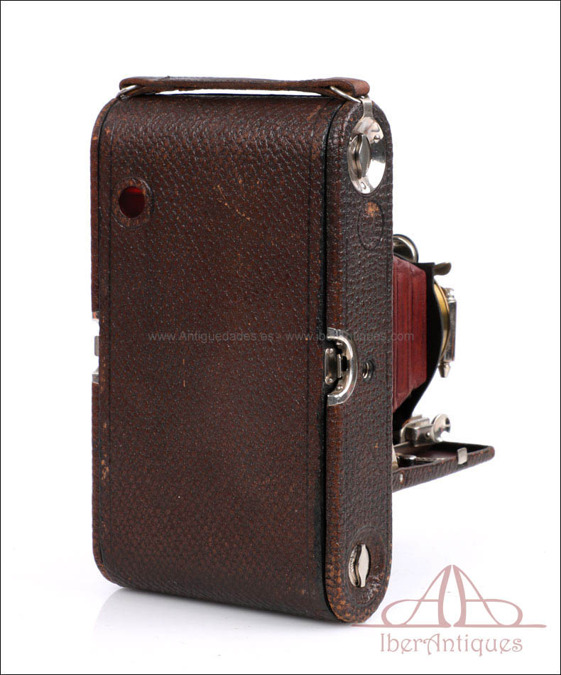 Esta magnífica Kodak Folding Pocket No. 3 Model C-2, fabricada entre 1900 y 1910, pertenece a una de las series más interesantes de las primeras cámaras de fuelle producidas en Rochester por Eastman Kodak Co. La pieza que presentamos destaca inmediatamente por su porte compacto, su bellísimo fuelle rojo y la elegante carcasa revestida en cuero marrón texturado, elementos que evocan la estética refinada de la fotografía portátil de principios del siglo XX. Se trata de una cámara diseñada para película tipo 118 mm, destinada a usuarios que buscaban un aparato robusto, fiable y capaz de producir negativos de gran formato dentro de un cuerpo sorprendentemente manejable para su época. El ejemplar se conserva íntegro.