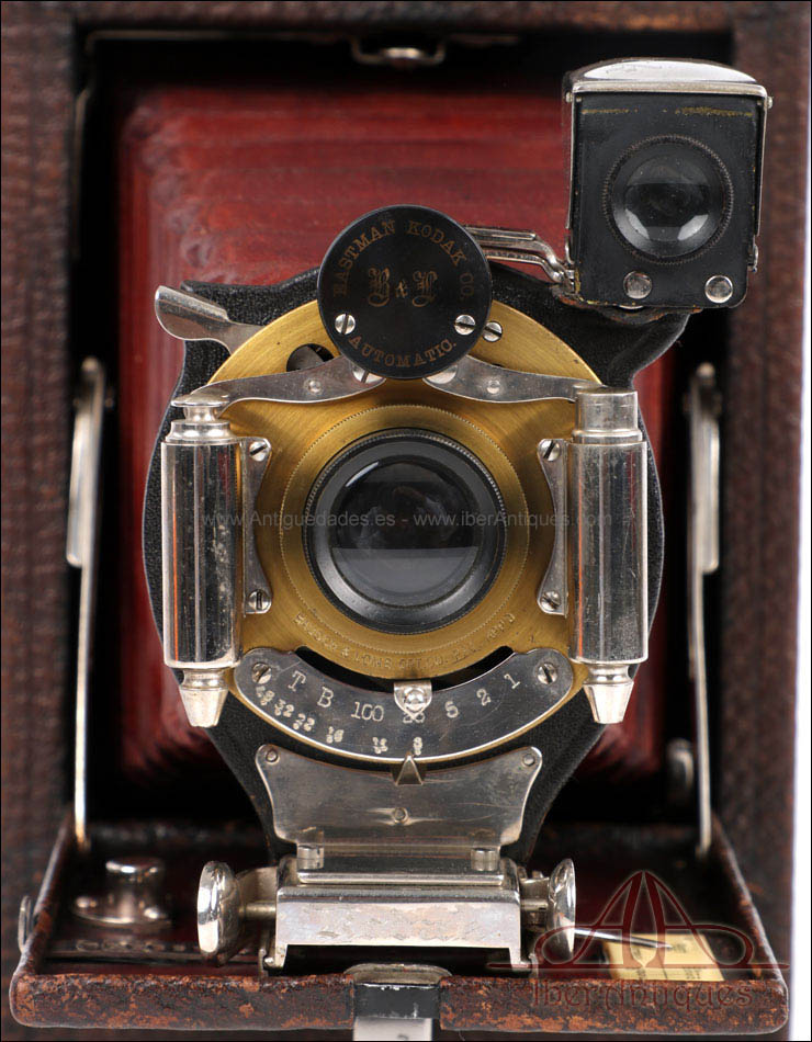 El conjunto óptico está formado por un objetivo montado en un obturador automático Eastman Kodak, claramente visible en las inscripciones del frontal. El obturador funciona con precisión y responde correctamente en sus modos T y B, así como en las velocidades marcadas. El objetivo presenta lentes limpias, sin velos ni hongos visibles, permitiendo todavía una formación de imagen sorprendentemente nítida. El visor plegable lateral mantiene su alineación y se acciona con suavidad, mostrando un grado de conservación poco habitual en cámaras de esta serie.