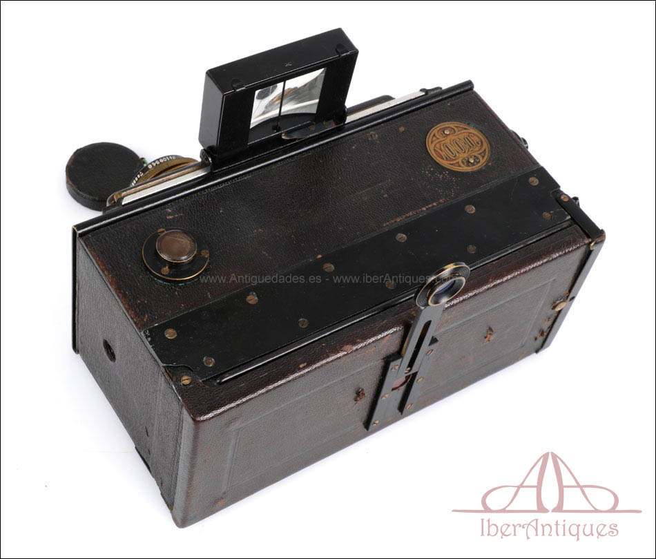 Esta antigua cámara estereoscópica Monobloc, fabricada en Francia alrededor de 1912, es una pieza extraordinaria tanto por su diseño como por su completo estado de conservación. Se trata de un modelo avanzado para su época, fabricado por V. Lièbe en París y destinado al exigente mercado de fotografía estereoscópica en formato 6 × 13 cm. Con su característico cuerpo metálico recubierto en cuero, sus hermosos objetivos con monturas de latón y su visor abatible, esta cámara demuestra la elegancia técnica y estética que marcó a los fabricantes franceses del primer cuarto del siglo XX. El número de serie 2389, situado en la parte frontal del cuerpo, confirma que se trata de un ejemplar temprano dentro de la producción total del modelo, lo que incrementa notablemente su valor como pieza histórica y de colección.