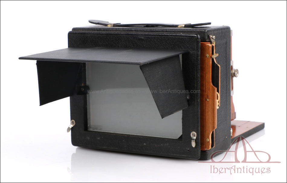 El chasis para placas 12×9 cm acompaña la cámara y encaja perfectamente en la parte posterior. El cristal esmerilado se presenta limpio y protegido por su visera abatible, indispensable para componer la imagen en exteriores. Los herrajes mantienen su integridad mecánica, con cierres laterales que aseguran una sujeción firme y estable. El conjunto muestra una apariencia muy equilibrada, con una pátina que combina el uso histórico con la dignidad de una pieza bien cuidada y lista para ser exhibida. Su estética clásica, con la mezcla de madera cálida, cuero negro y metal plateado, la convierte en una pieza muy agradable a la vista y plenamente representativa de la fotografía de su tiempo.