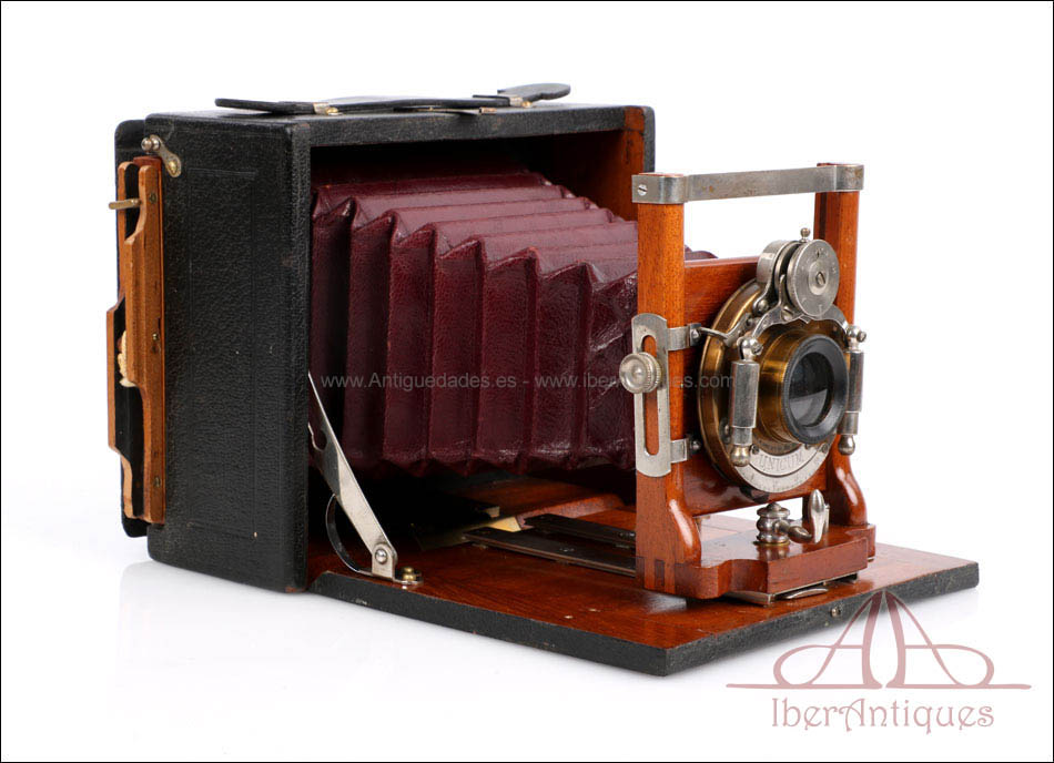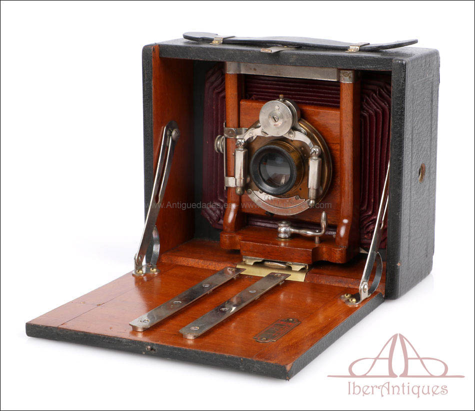 Esta antigua cámara Rochester Optical Premo para el mercado europeo, fabricada en Estados Unidos circa 1900, es un delicioso ejemplo de la producción fotográfica norteamericana de finales del siglo XIX y comienzos del XX, con una construcción cuidada y una presencia estética que inmediatamente llama la atención. Se trata de un modelo plegable de placas con chasis de 12×9 cm, concebido para fotógrafos itinerantes y para aficionados exigentes de su tiempo, y que destaca por su combinación de madera noble barnizada, fuelle de cuero granate y herrajes metálicos con un acabado elegante y funcional. A nivel estructural, mantiene esa mezcla de ligereza y solidez que caracterizaba a los Premo de época, hechos para viajar pero sin renunciar a la calidad.