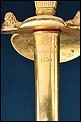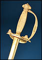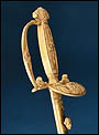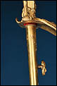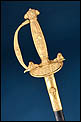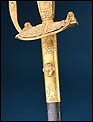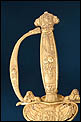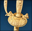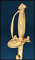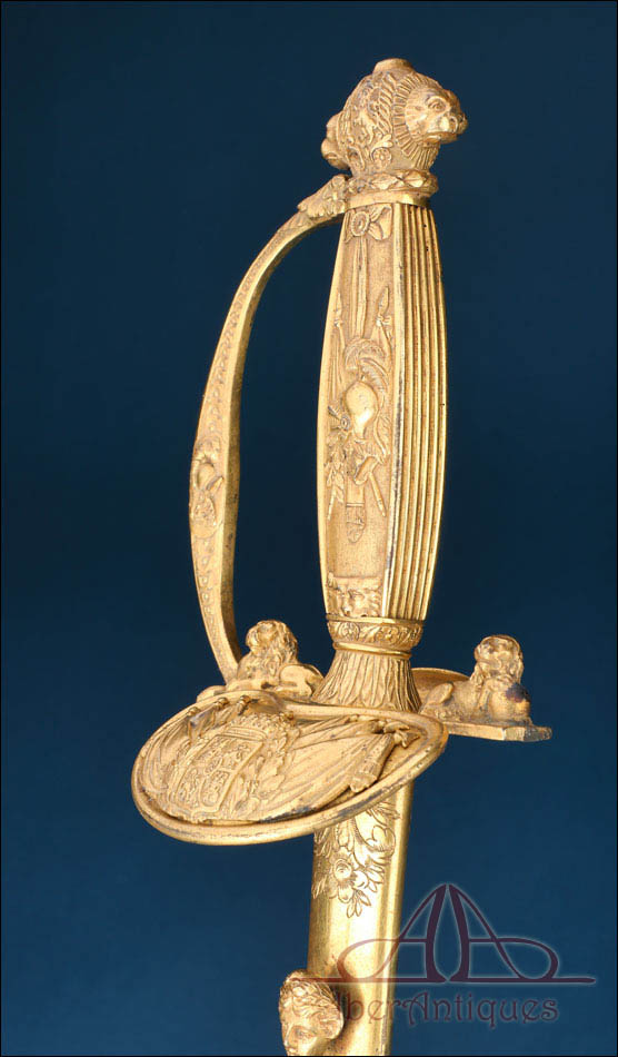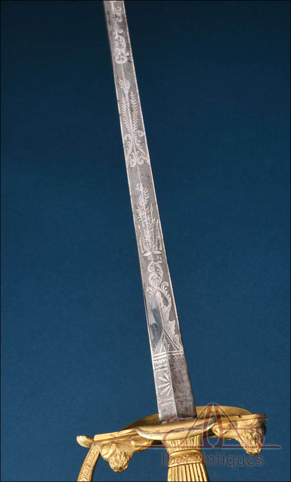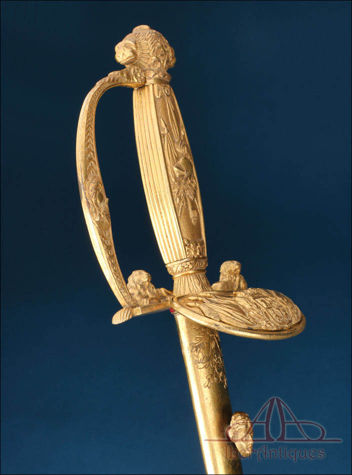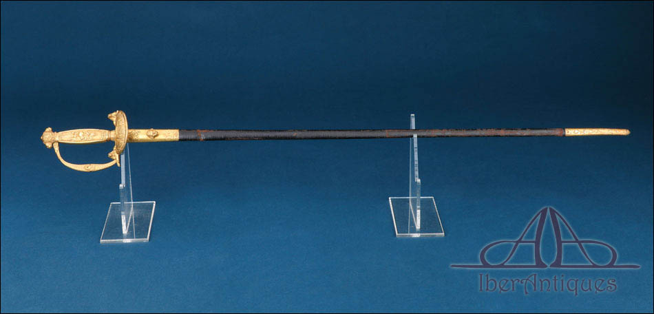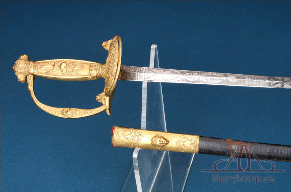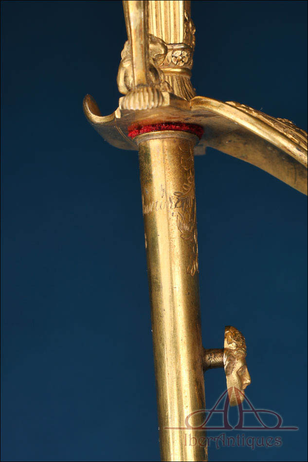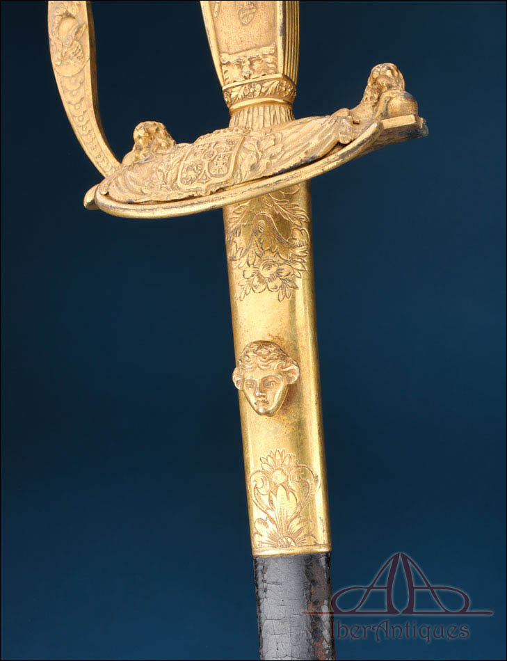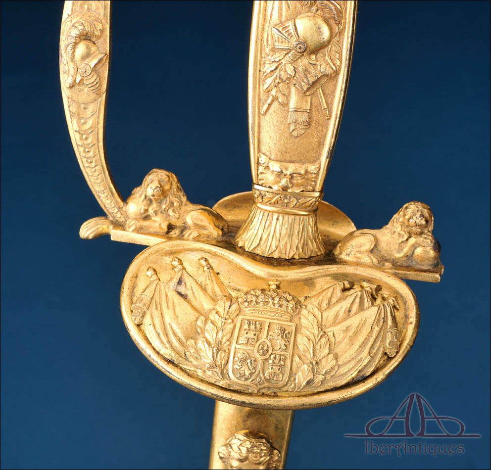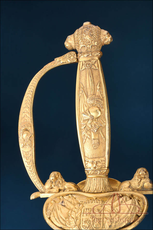 La empuñadura, realizada en bronce dorado al mercurio, presenta una rica decoración cincelada con iconografía heráldica y motivos militares de inspiración neoclásica. La calidad de la fundición y el dorado reflejan una manufactura de alto nivel propia de piezas destinadas a contextos protocolarios y de representación.
