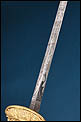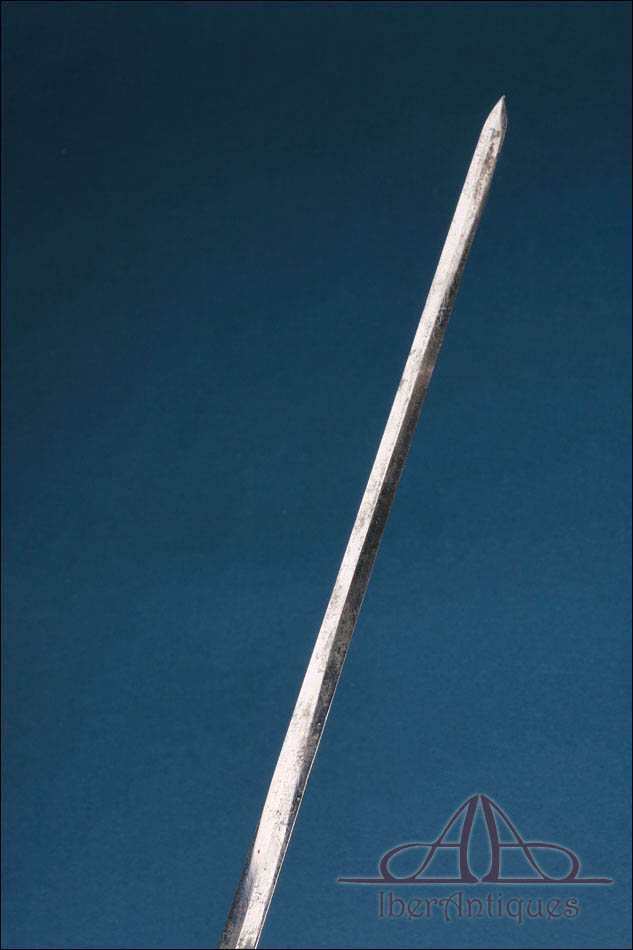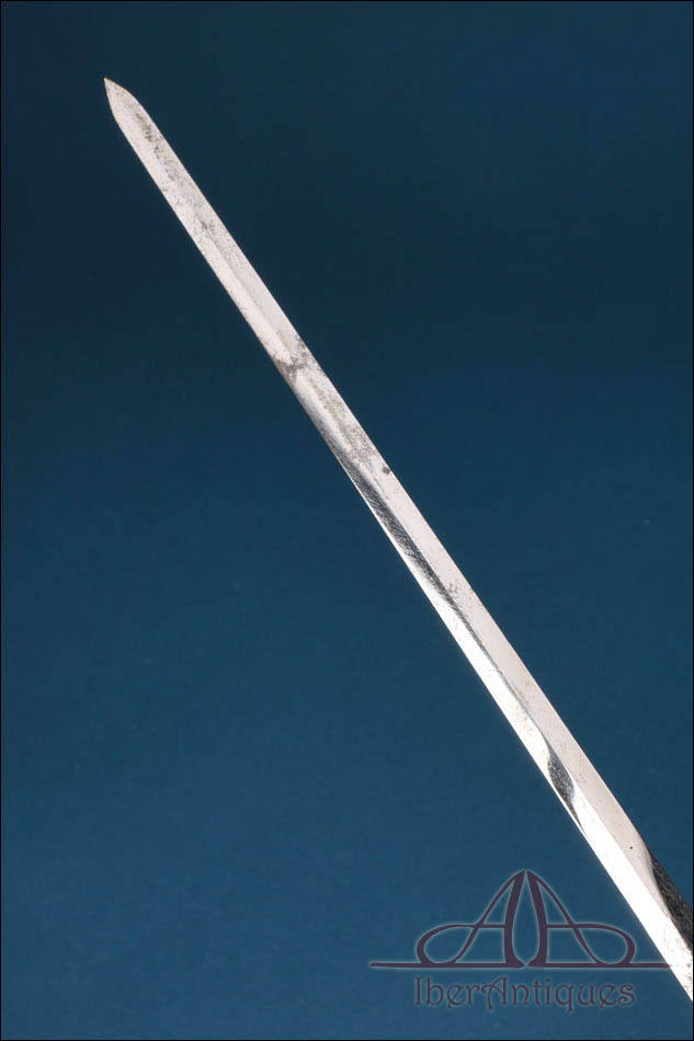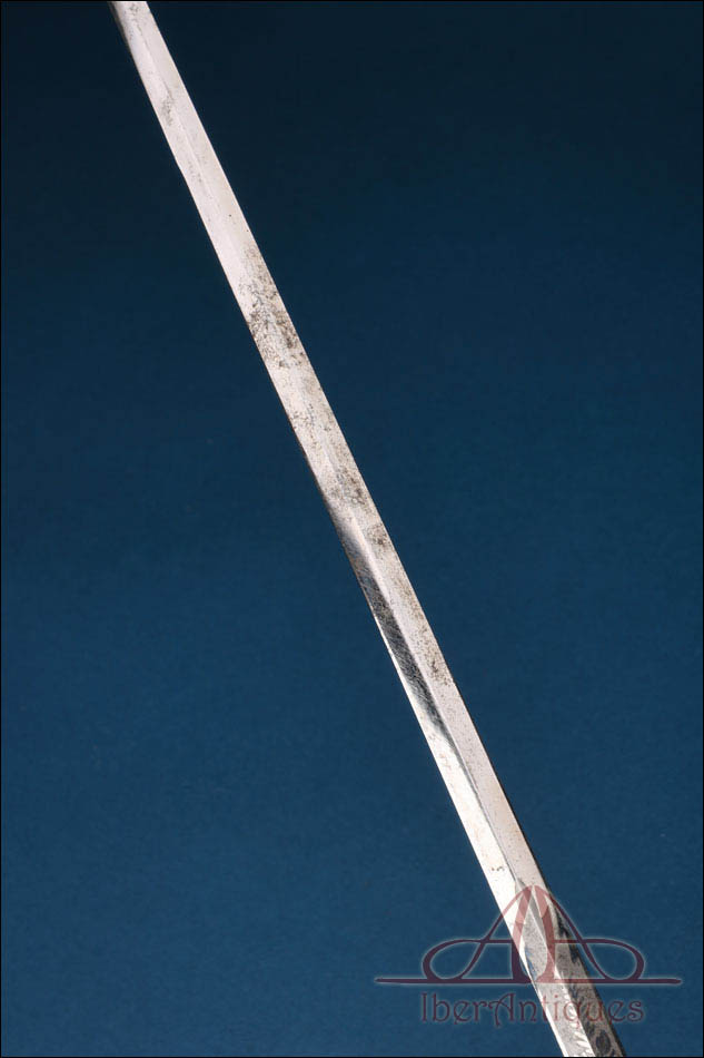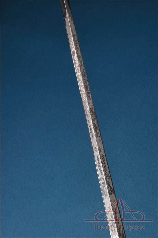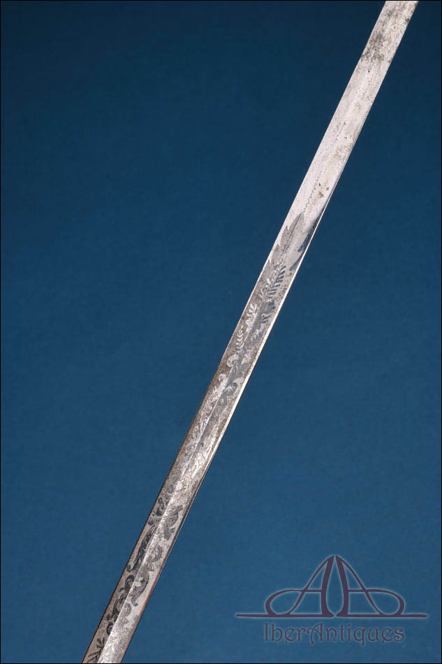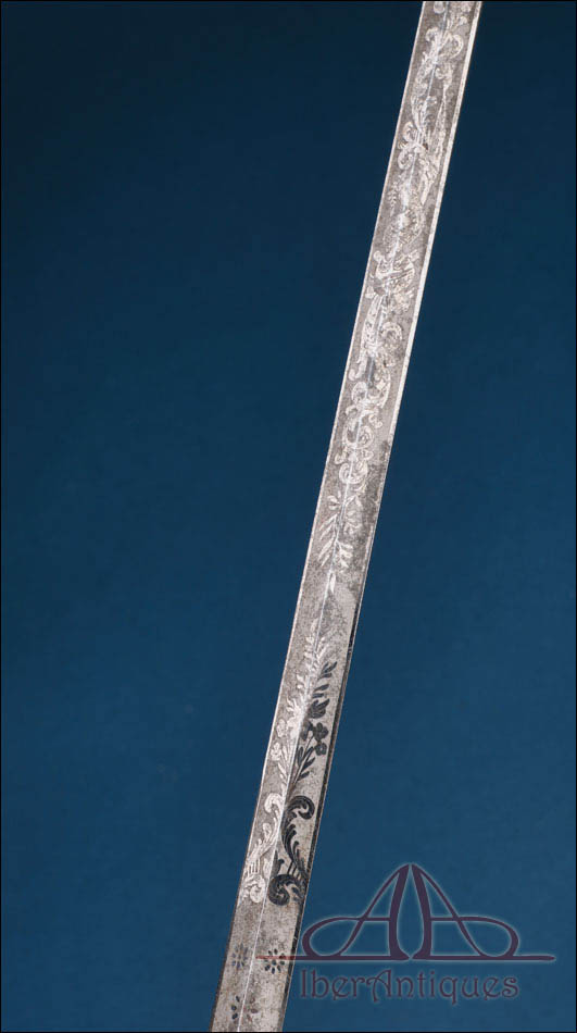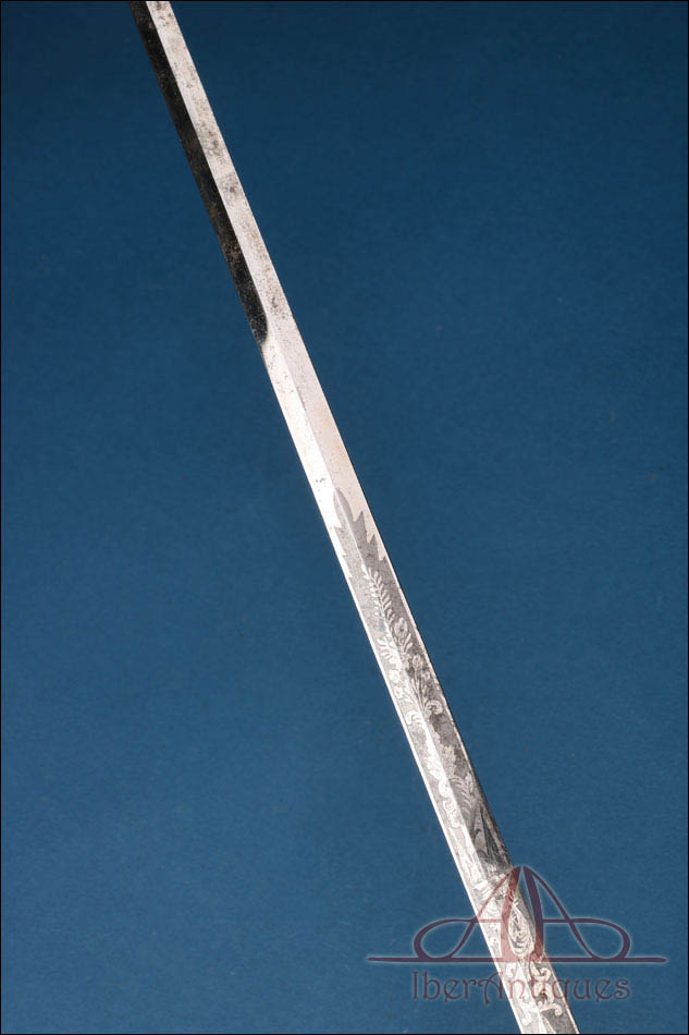 La hoja, de sección triangular, conserva decoración grabada al ácido con repertorio ornamental característico de la producción española romántica. Este tipo de hojas, estilizadas y elegantes, eran habituales en espadas de carácter diplomático y cortesano, priorizando la presencia simbólica sobre la funcionalidad militar.