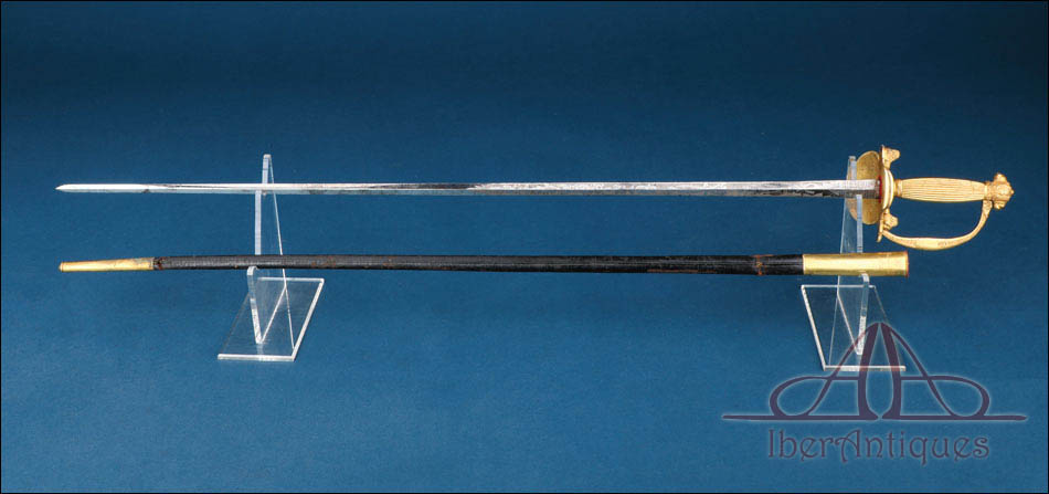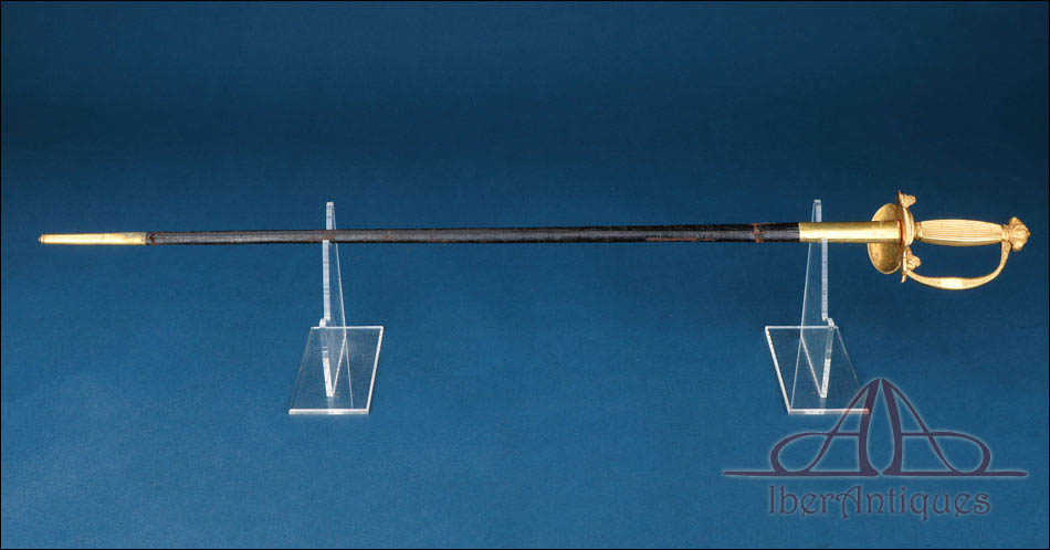 Importante y rara espada diplomática española fechada en 1838, perteneciente al ámbito ceremonial y representativo del cuerpo diplomático del siglo XIX. Este tipo de armas, destinadas a embajadores y altos representantes del Estado, constituían símbolos de prestigio institucional y rango social, siendo producidas en talleres especializados con altos estándares artísticos y técnicos.
