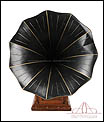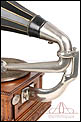 Su gran trompa metálica trasera en color negro con finos filetes dorados, restaurada respetando el diseño original, ofrece una proyección sonora sorprendente, clara y potente. Este modelo pertenece a la transición entre las trompas frontales y las traseras, e incluso conserva el enganche lateral original que permitía montar la trompa frontal en configuraciones anteriores.