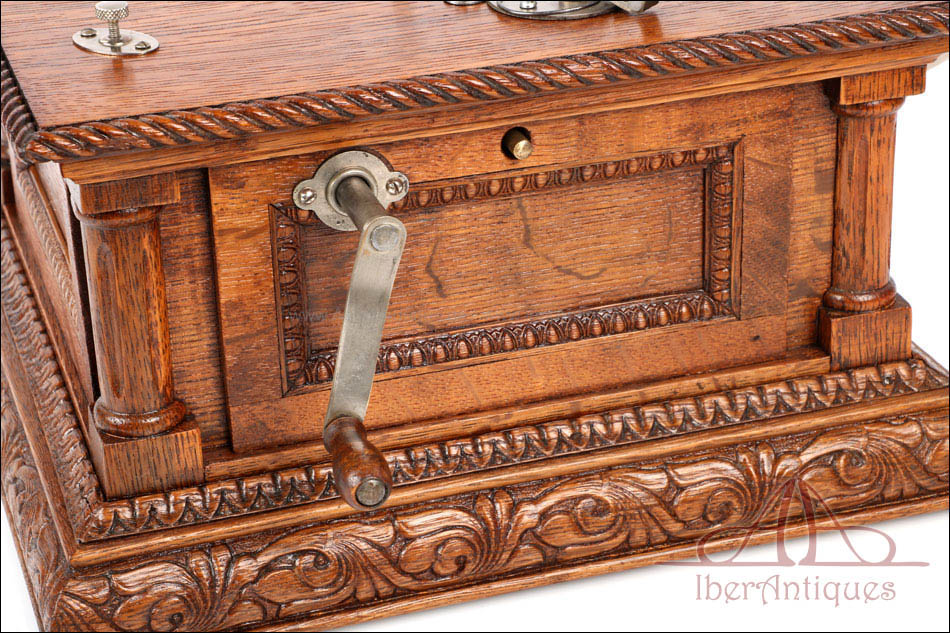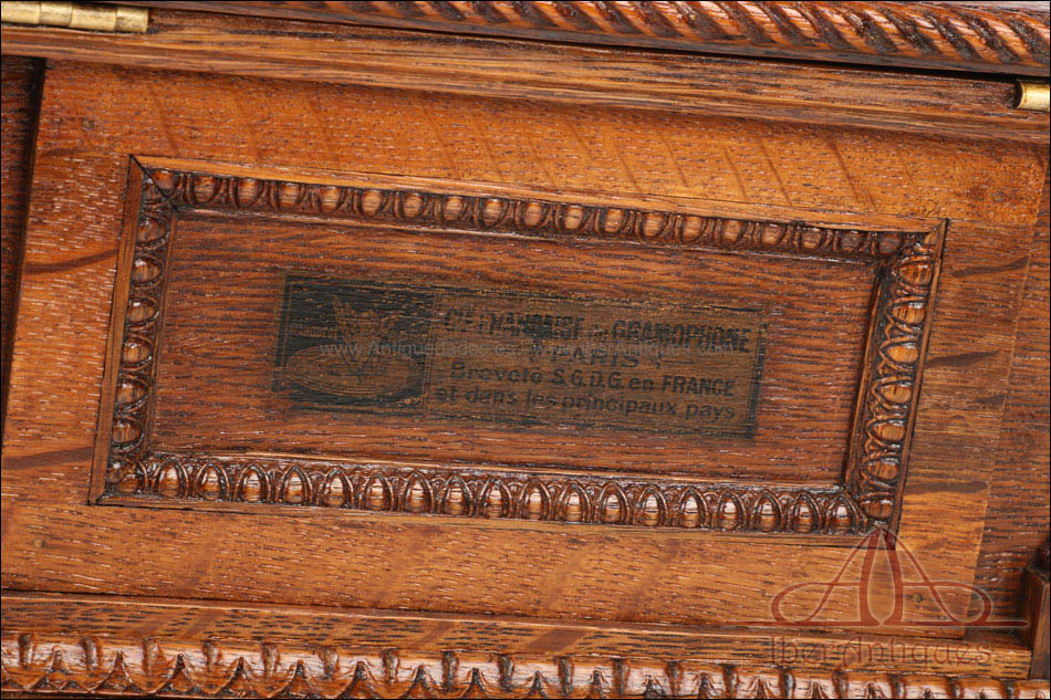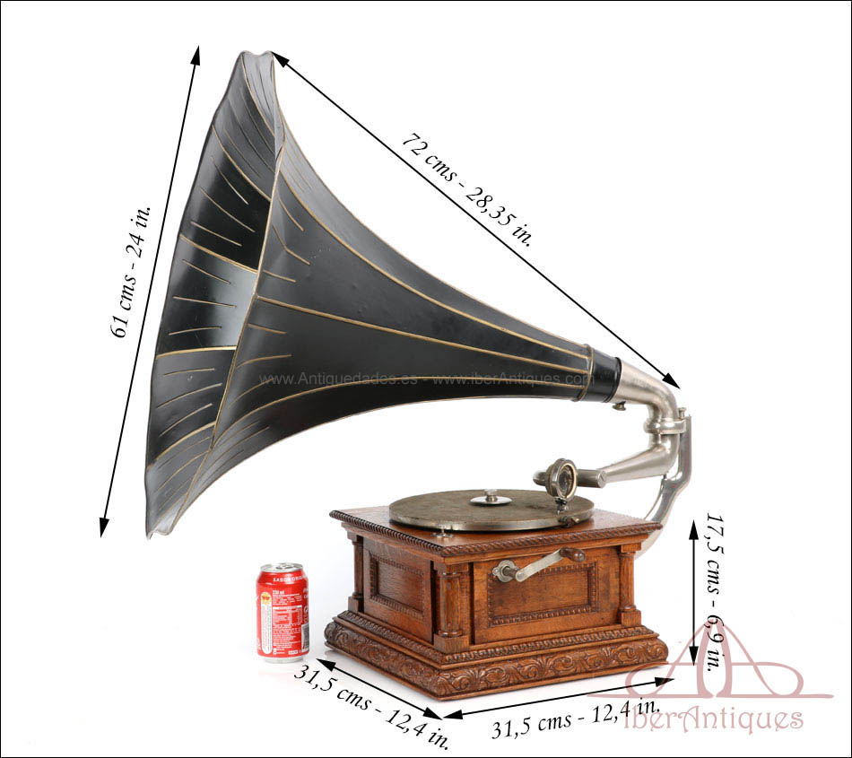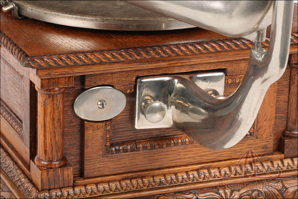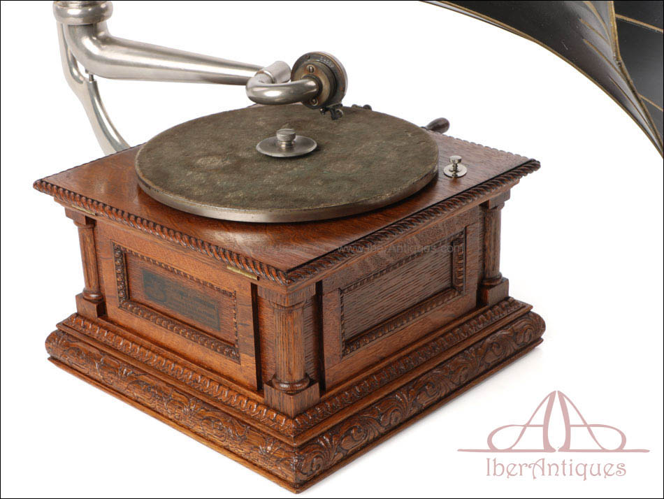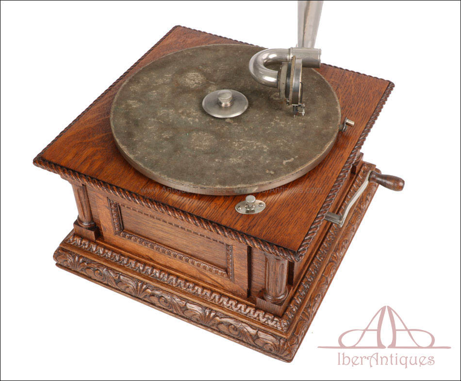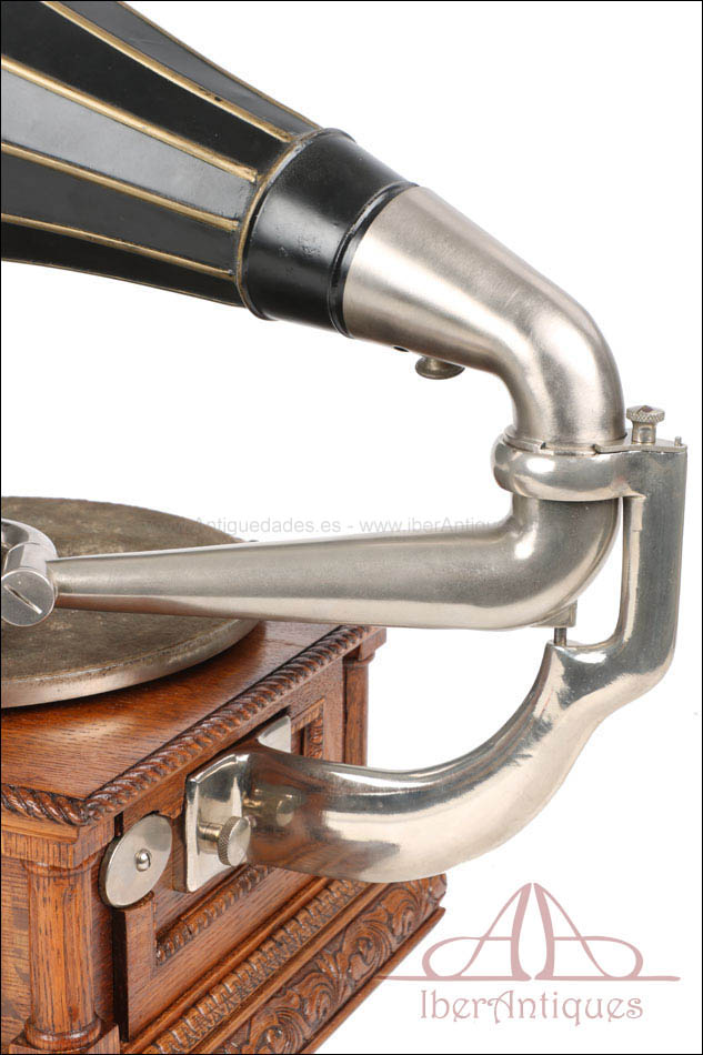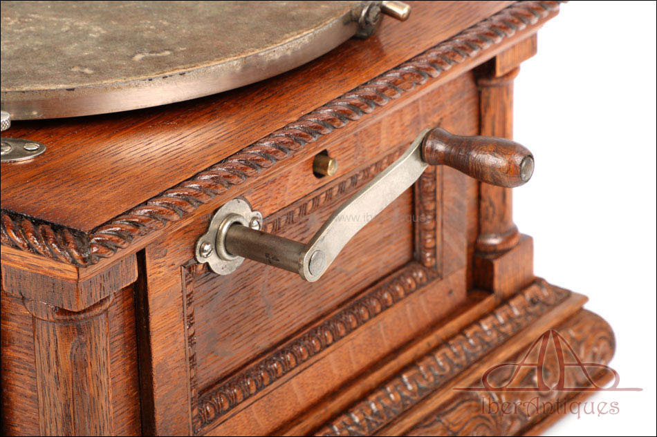 El gramófono está construido sobre una sólida caja de roble macizo, ricamente tallada a mano en todo su perímetro con motivos florales y molduras profundas, que evocan los modelos de presentación destinados a la alta burguesía de la Belle Époque. En la parte superior se encuentra el plato metálico original, aún revestido con su fieltro de época, que ha sido conservado deliberadamente por su excelente estado funcional y su valor histórico.