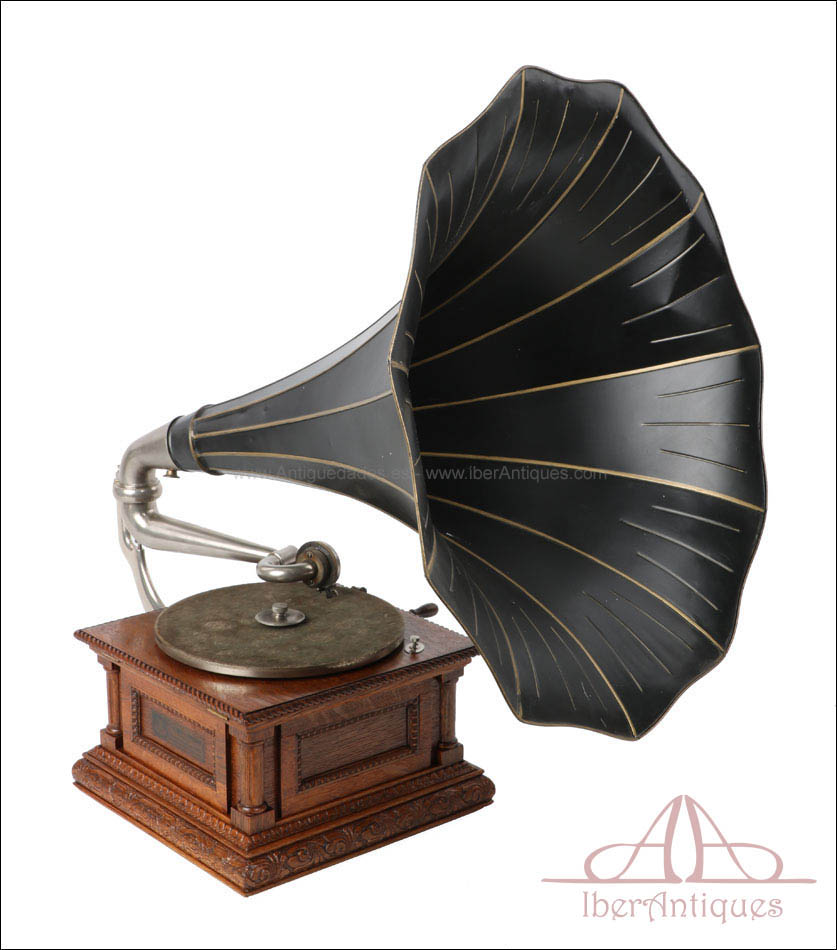 Excepcional gramófono antiguo modelo Monarch Senior Especial fabricado por Gramophone & Typewriter Ltd., filial francesa de la célebre marca que más tarde adoptaría el nombre His Master’s Voice. Esta pieza, datada en torno a 1907, representa una de las cumbres de la fonografía mecánica europea de principios del siglo XX, tanto por su refinamiento estético como por su ingeniería acústica de primer nivel.