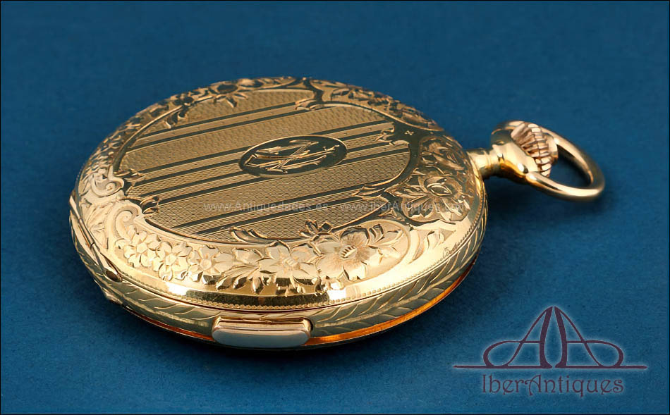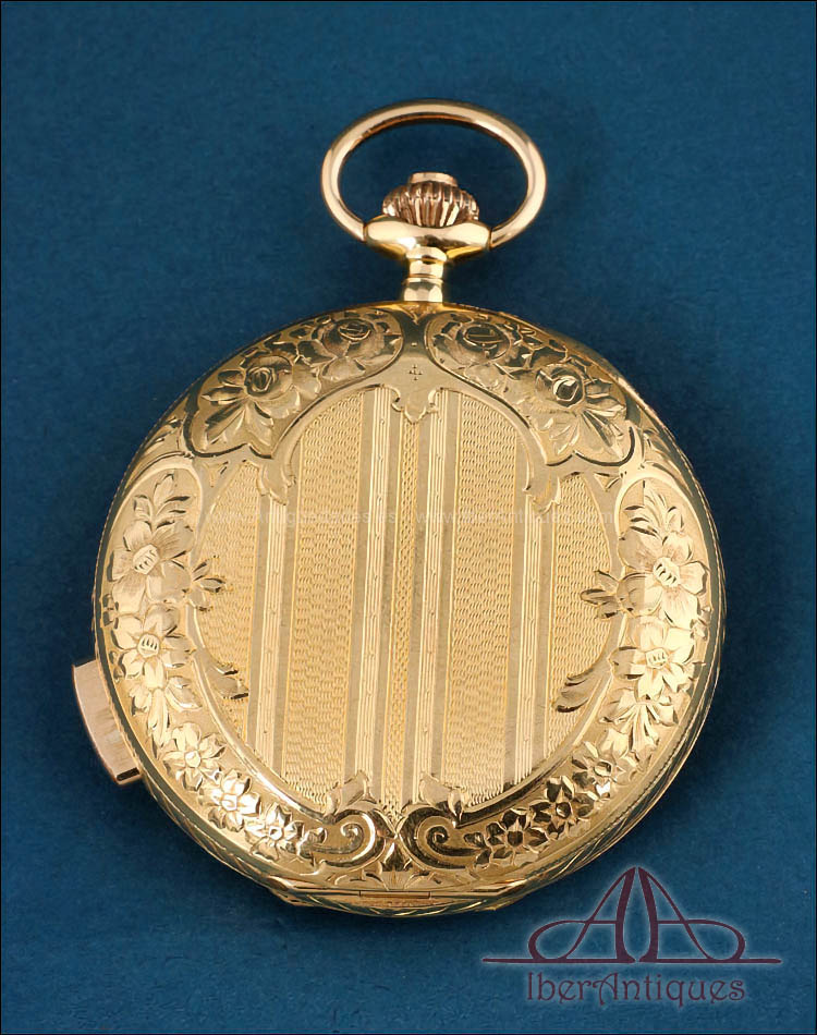 Este antiguo reloj de bolsillo Eberhard & Co., fabricado en Suiza hacia 1890, es una pieza de alta relojería en oro macizo de 18K que destaca por su excelente conservación y por la calidad de su sonería a minutos. La caja, profusamente grabada a mano, muestra motivos florales muy definidos que cubren tanto la tapa trasera como el borde, con un trabajo homogéneo y bien ejecutado. El resultado es una pieza elegante, sólida y representativa de la relojería suiza de finales del siglo XIX.