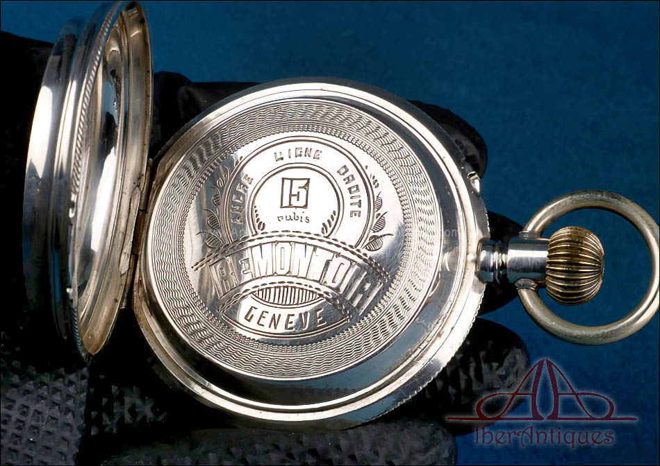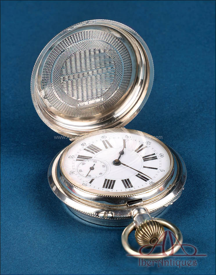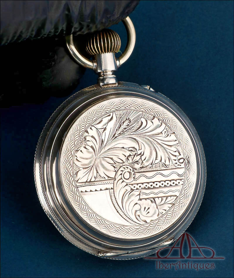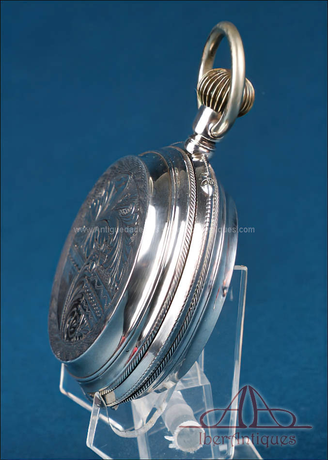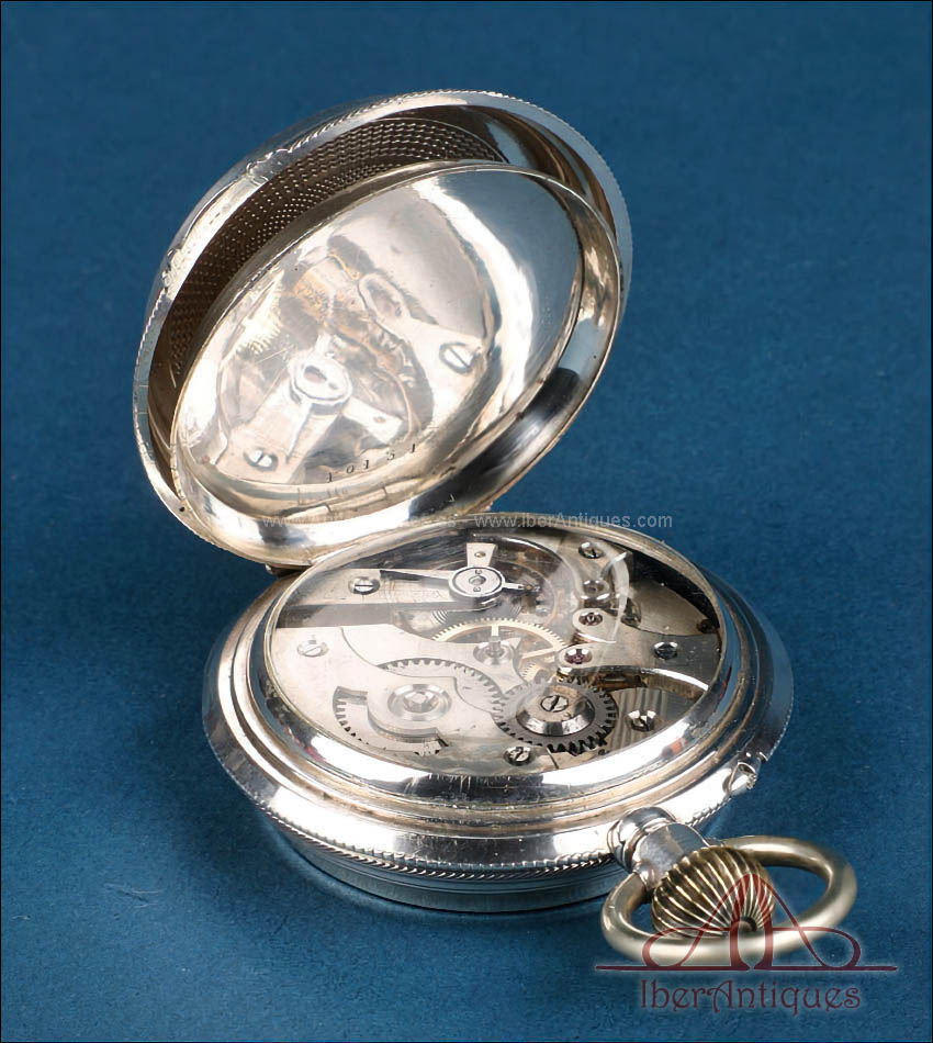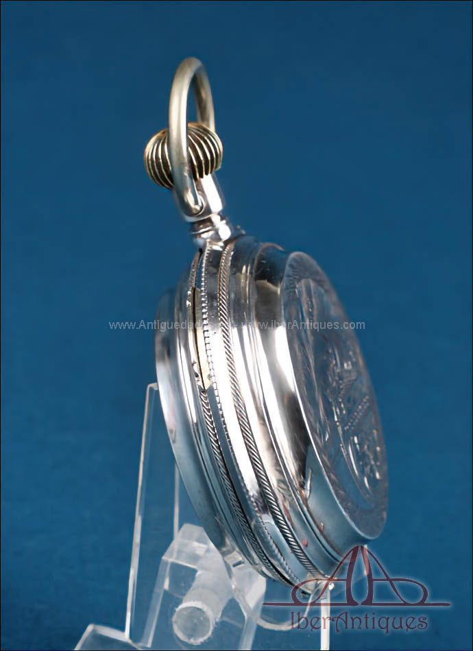 Antiguo Reloj de Bolsillo de 15 Rubíes y Caja Grabada Plateada. Suiza, 1880–1890 |