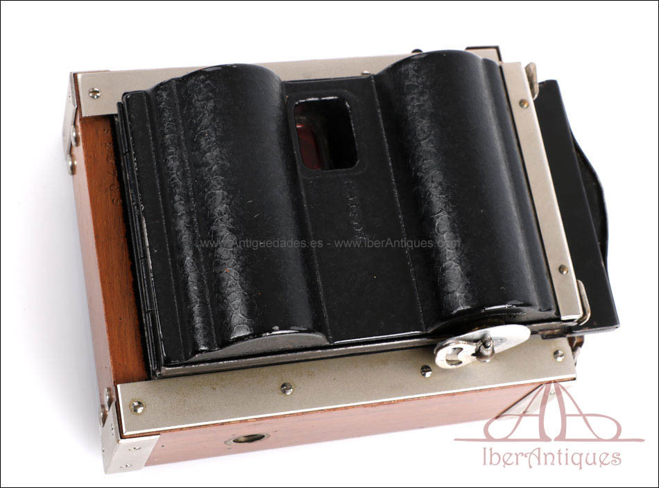 Una de las características más interesantes de esta unidad es que, aunque fue diseñada para placas de 6,5×9 cm, viene equipada con un raro accesorio posterior para roll-film. Este adaptador permite usar película en rollo, una característica muy valorada por coleccionistas y fotógrafos que buscan experimentar con formatos alternativos en cámaras de época. El ancho de la ventana y la disposición interna del adaptador sugieren compatibilidad con película cercana al estándar de 6×9 cm, muy utilizada en los años veinte, lo que incrementa aún más el atractivo del conjunto. Este tipo de adaptadores no es común de encontrar hoy en día, especialmente en un estado tan bien conservado y operativo.