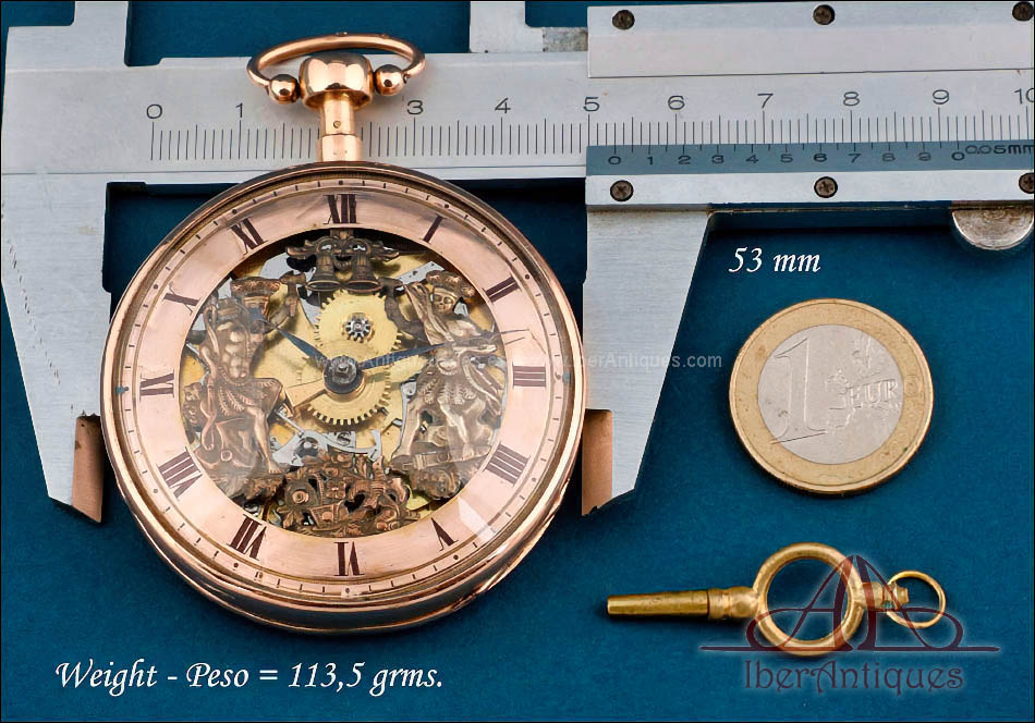 La esfera esqueletada deja a la vista la animada composición creada mediante figuras en relieve donde dos guerreros indígenas con tocado y de inspiración exótica flanquean el tren de ruedas y sostienen arcos en sus manos, ejemplo perfecto del gusto romántico y teatral por “los pueblos antiguos y su gente” que dominó el imaginario europeo durante el siglo XVIII y XIX. Sobre ellos se alzan las pequeñas campanas que los autómatas golpean al accionar la repetición. La escena se completa con motivos vegetales y elementos simbólicos que armonizan con los tonos dorados del movimiento. El aro exterior, en oro rosa, presenta elegantes numerales romanos que enmarcan la composición.