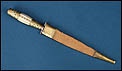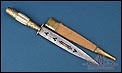 El cuchillo conserva su vaina original completa, revestida en material textil y equipada con monturas metálicas. El estado general de conservación es excelente, acorde a su antigüedad, manteniendo integridad estructural y una presencia visual muy notable. La combinación de hoja calada, incrustación metálica y conservación integral de la vaina sitúa esta pieza dentro de los ejemplares más interesantes de su tipología.