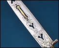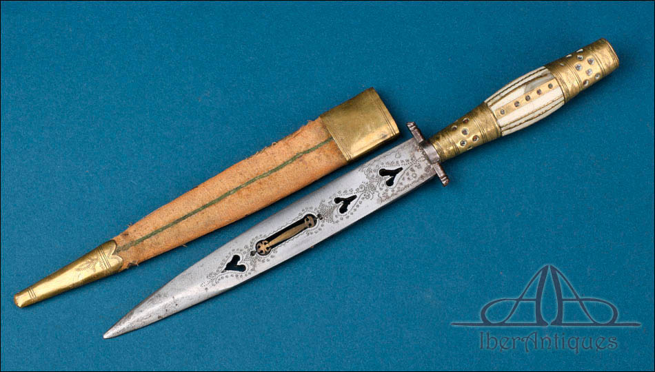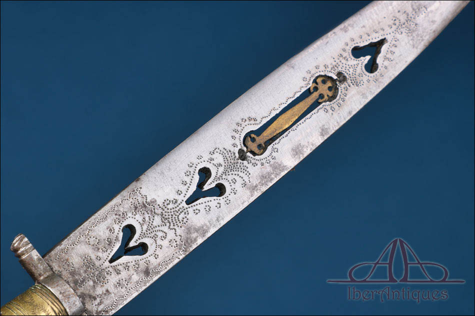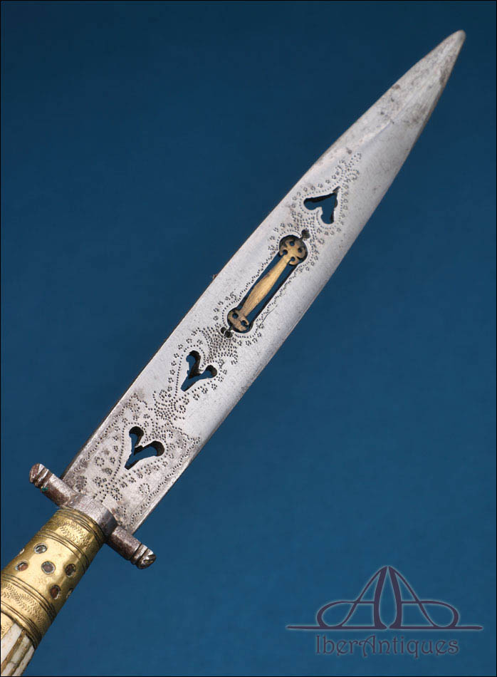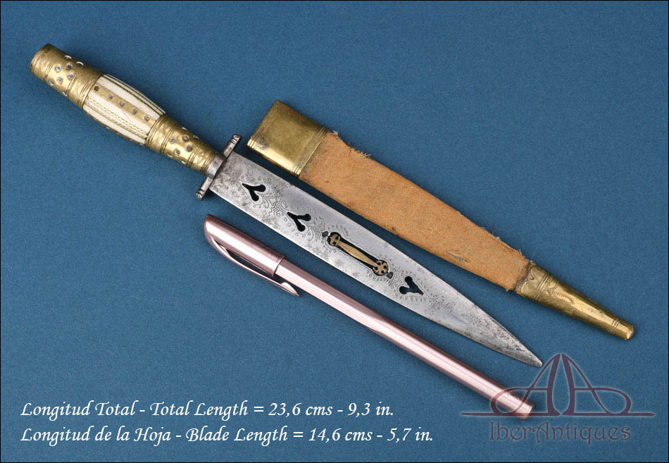 La hoja presenta sección triangular, con doble filo en la zona de la punta, y destaca especialmente por su elaborada decoración calada con motivos de corazones. En el centro de la hoja se incorpora una singular lengüeta de latón incrustada, elemento ornamental poco frecuente que otorga al ejemplar una personalidad tipológica excepcional dentro del repertorio cuchillero español del siglo XIX.