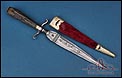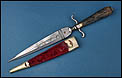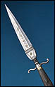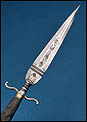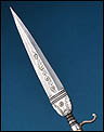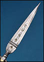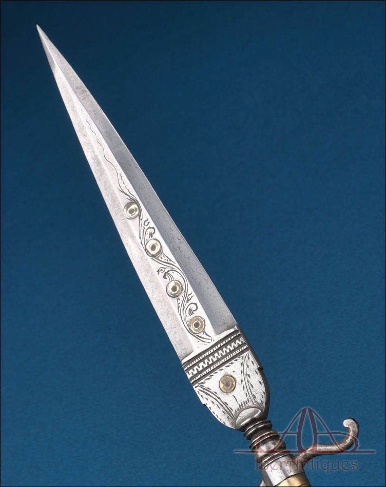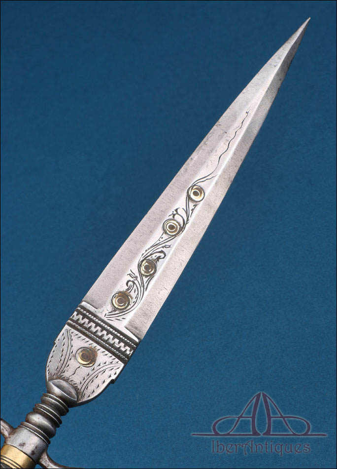 La hoja, de doble filo y perfil lanceolado, presenta una sólida ejecución en acero, con sección robusta y punta aguda destinada a maximizar su eficacia ofensiva. Ambas caras están decoradas mediante grabado burilado de motivos vegetales estilizados que recorren longitudinalmente la superficie, aportando al conjunto un carácter ornamental refinado sin comprometer su funcionalidad.