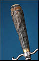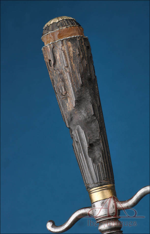 La empuñadura está realizada en asta tallada con decoración longitudinal incisa. Presenta pérdidas materiales y deterioros. A pesar de ello, conserva su estructura original en buen estado.