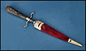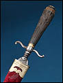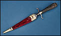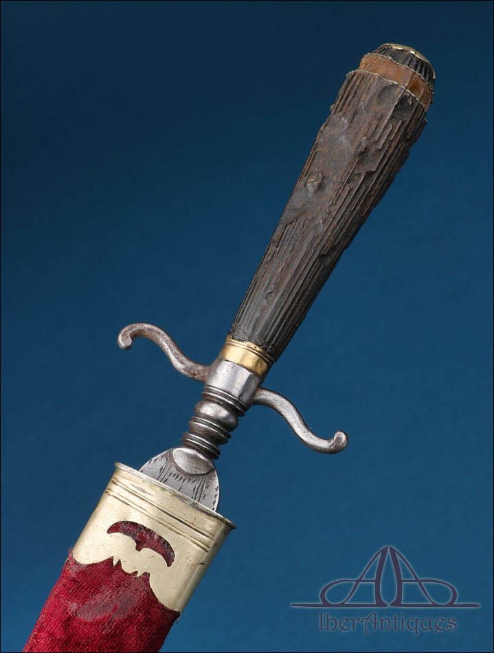La daga mantiene su vaina original, construida en madera recubierta de textil rojo, con brocal y contera de latón. Estos elementos metálicos refuerzan estructuralmente la vaina y aportan coherencia estética al conjunto.
