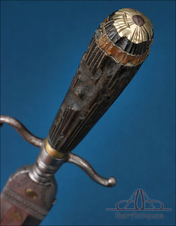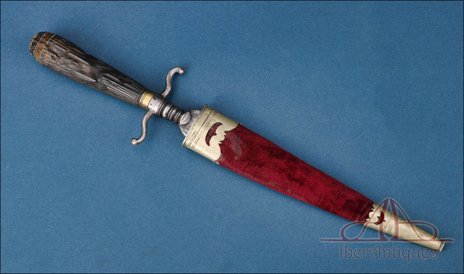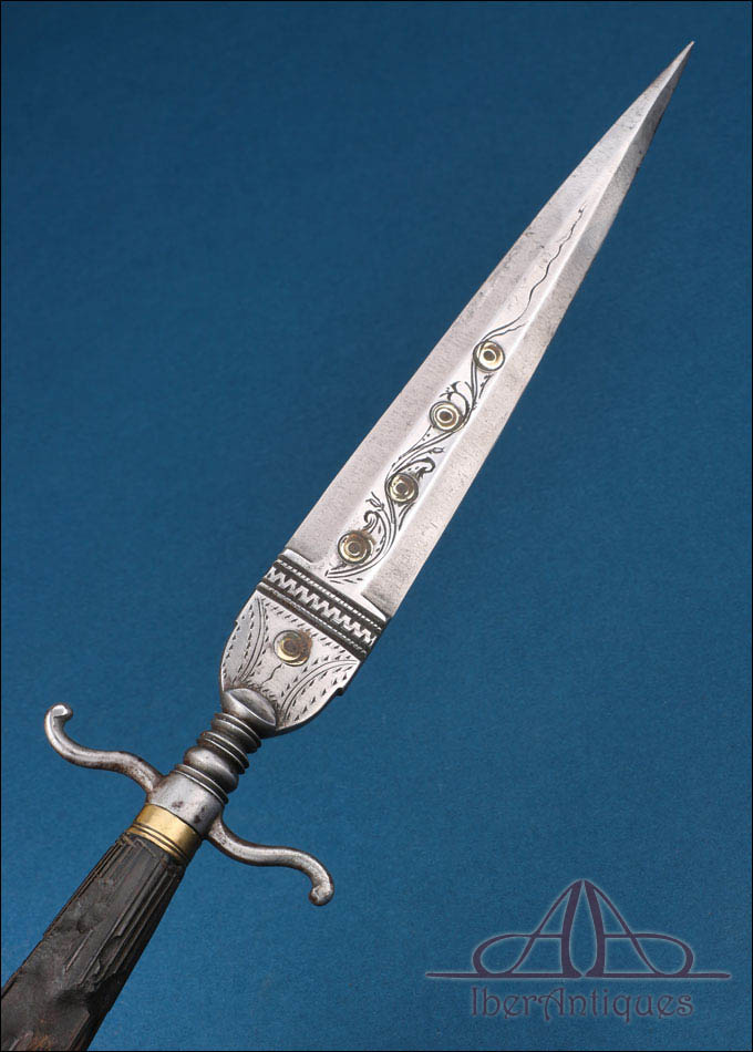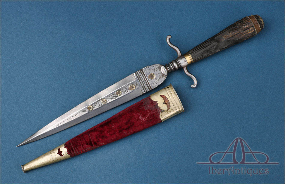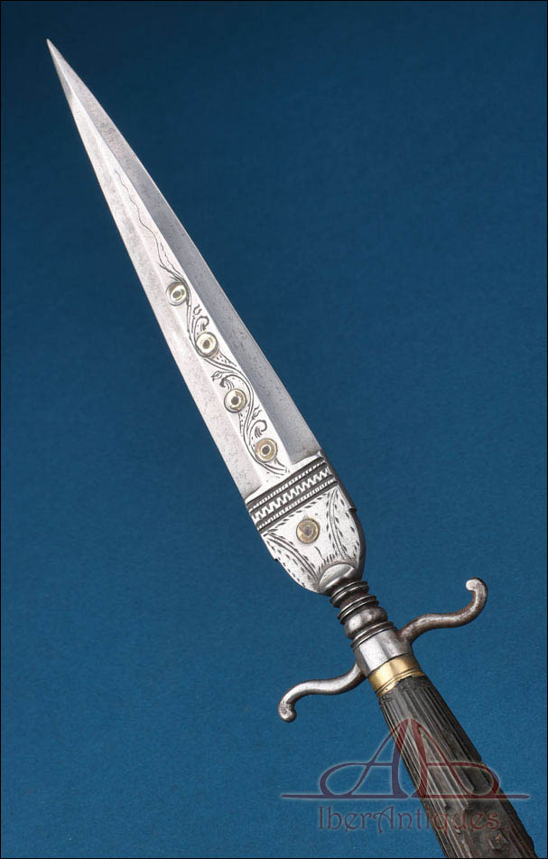 Interesante y rara daga antigua atribuible al ámbito italiano meridional, probablemente de tradición napolitana, datable hacia finales del siglo XVIII o comienzos del siglo XIX. Se trata de un arma blanca de notable elegancia , representativa de la cuchillería italiana tradicional en un momento de transición entre los lenguajes decorativos barrocos tardíos y las soluciones funcionales propias del armamento civil del periodo.