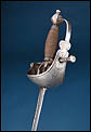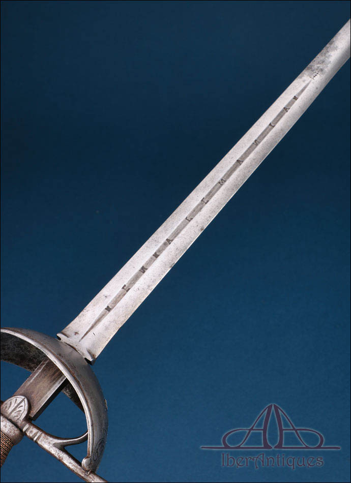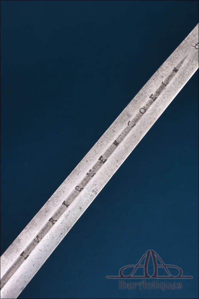 El puño está recubierto con torzal metálico, conservando una textura firme y visualmente equilibrada con el resto de la estructura. Este tipo de empuñadura no solo aportaba mayor seguridad en el agarre, sino que también contribuía a la elegancia funcional del arma. La hoja es recta y estilizada, con acanaladura longitudinal central. En uno de sus lados aparece claramente grabado el nombre “ENRIQUE COEL”, referencia directa al prestigioso espadero de origen alemán que suministró numerosas hojas al mercado español durante el siglo XVII. En el otro lado se observa la inscripción “EN ALEMANIA”, indicación de procedencia que confirma su fabricación en centros metalúrgicos germánicos especializados en este tipo de producción. Esta combinación de guarnición española y hoja alemana refleja una práctica habitual en la época para armas de calidad.