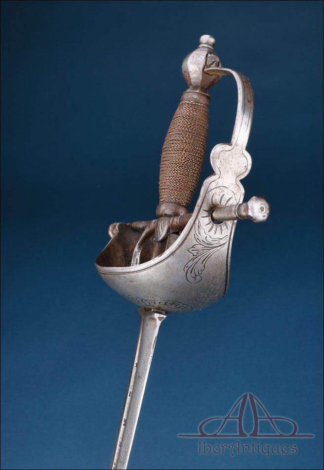 La guarnición es de hierro y responde al modelo de barquilla, evolución técnica destinada a mejorar la protección de la mano sin perder ligereza ni funcionalidad. Presenta una cazoleta de perfil profundo, con decoración vegetal grabada en su exterior. El conjunto se completa con gavilanes rectos, guardamano curvo y pomo de perfil globular, manteniendo una estética sobria y plenamente coherente con la tradición española de la época.