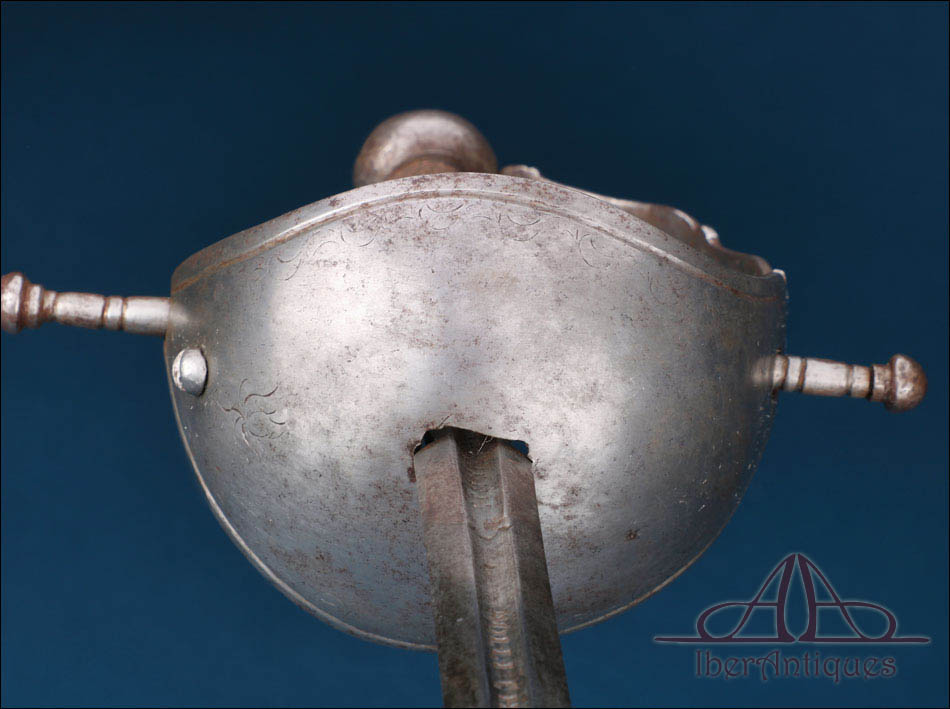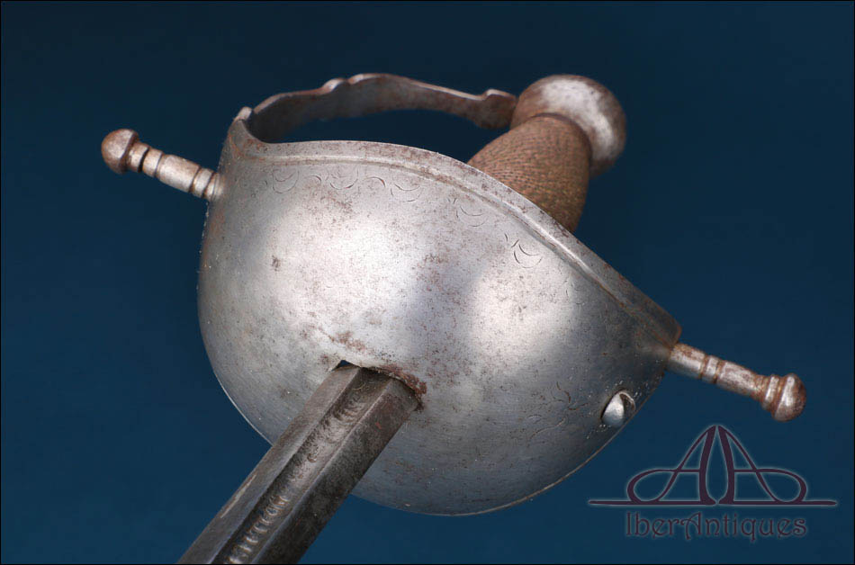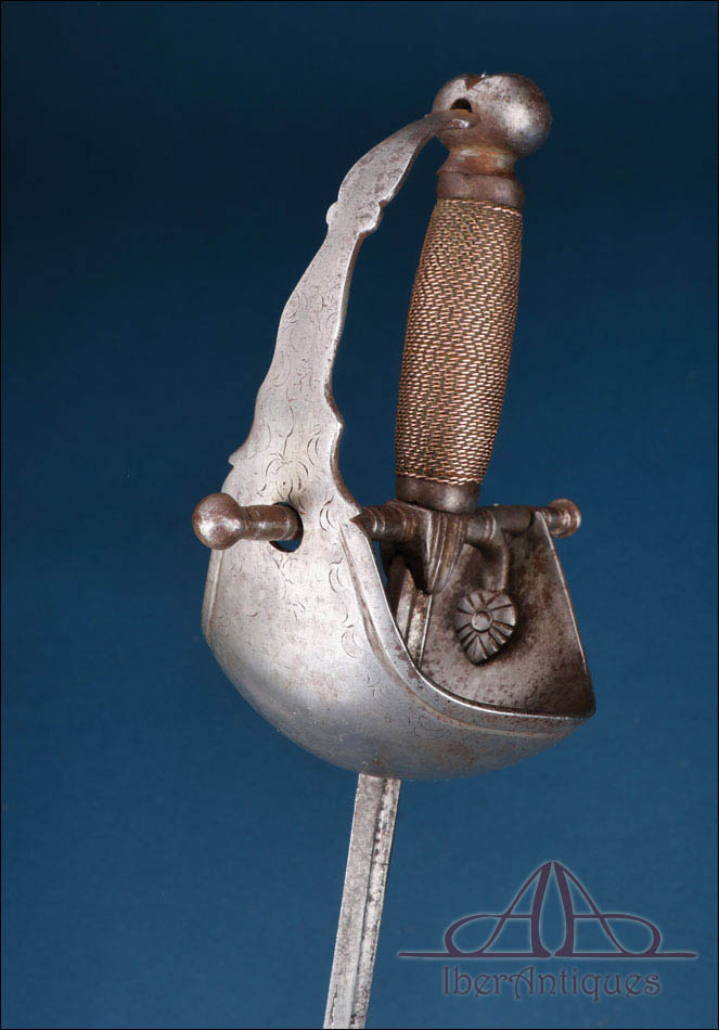 La guarnición está formada por una barquilla de acero que envuelve parcialmente la mano, ofreciendo protección eficaz sin perder ligereza. Presenta una configuración robusta y bien definida, con ligera decoración grabada en la parte exterior, compuesta por motivos vegetales sencillos, desgastados, pero claramente visibles. El conjunto se completa con guardamano curvo, arriaz recto con remates torneados y pomo de perfil globular, elementos todos ellos acordes con la tradición española del siglo XVII. El puño está recubierto con alambre metálico trenzado, conservando una textura firme y funcional que favorece el agarre y aporta carácter visual al arma.