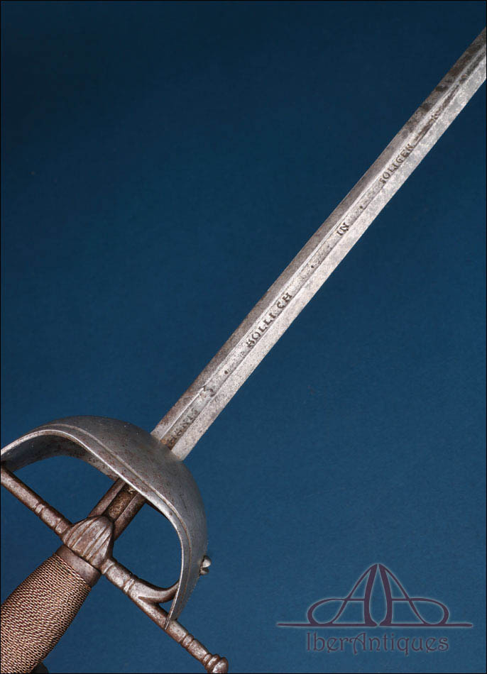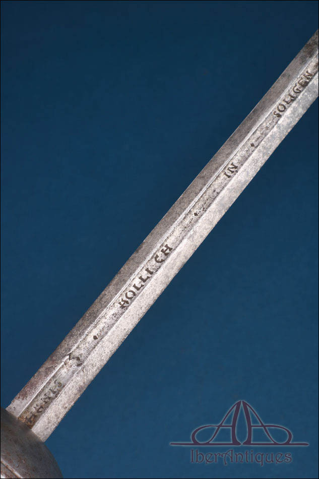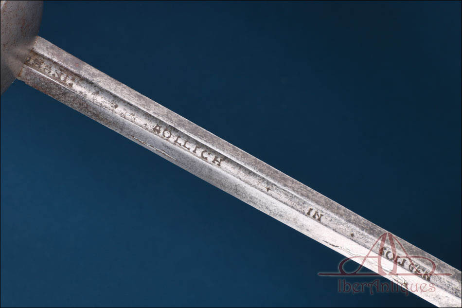 La hoja es recta y estilizada, con acanaladura longitudinal y proporciones propias de las espadas destinadas a la estocada. En uno de sus lados aparece la inscripción “Iohanis Hollich in Solingen”, indicación de fabricación en uno de los centros metalúrgicos más prestigiosos de Europa. Este tipo de hojas era habitual en espadas españolas de calidad, reflejando una práctica extendida en la época: la combinación de guarniciones españolas con hojas alemanas, fruto de las redes comerciales y de la reputación técnica de los talleres germanos.