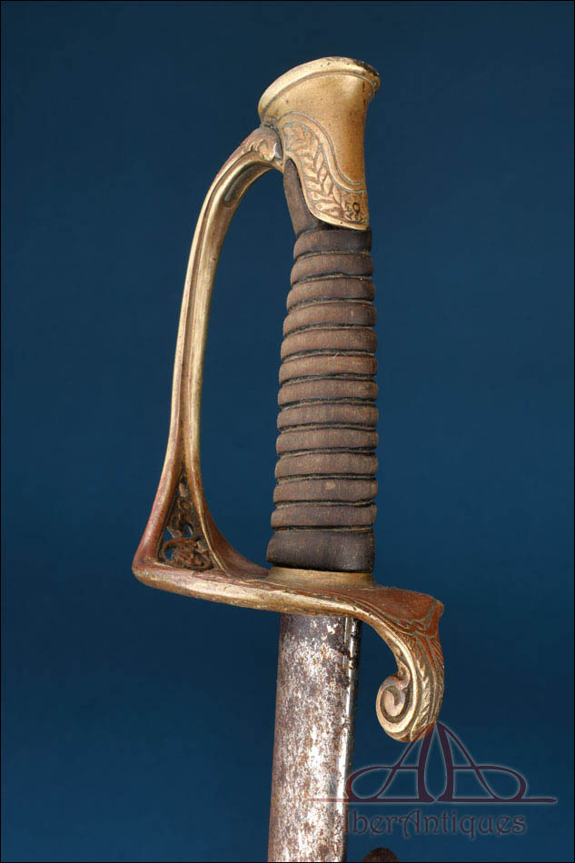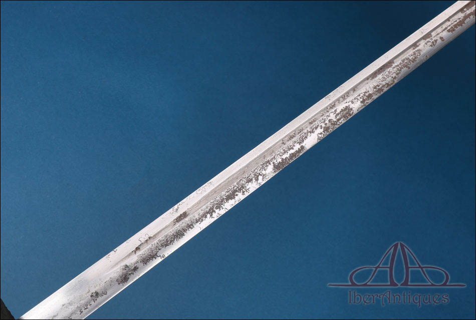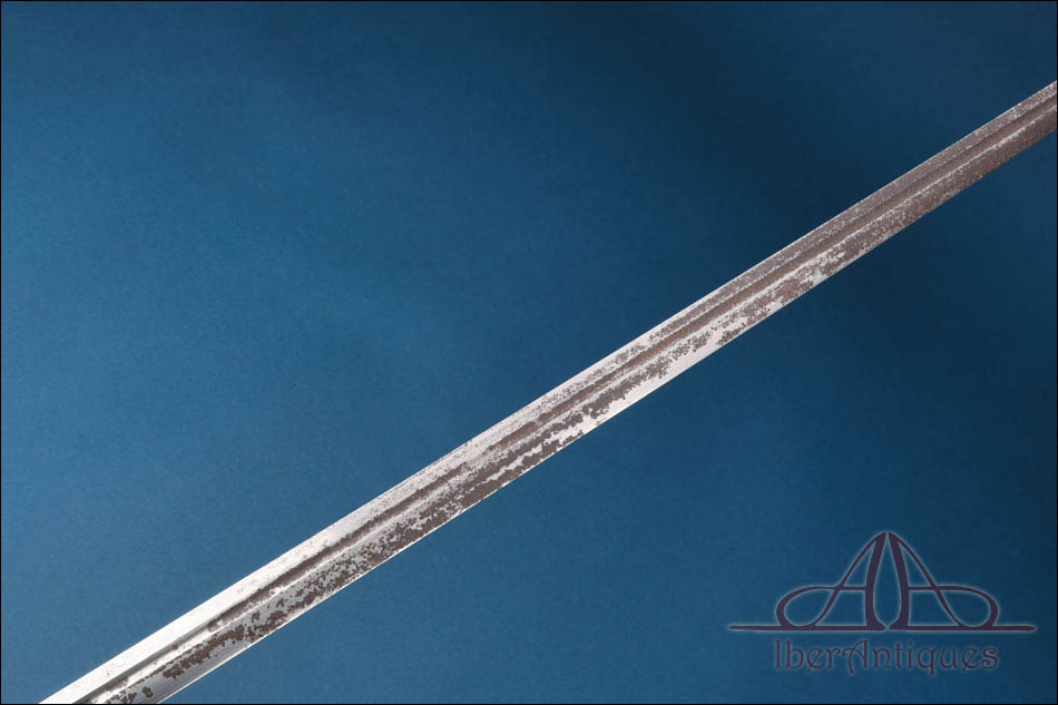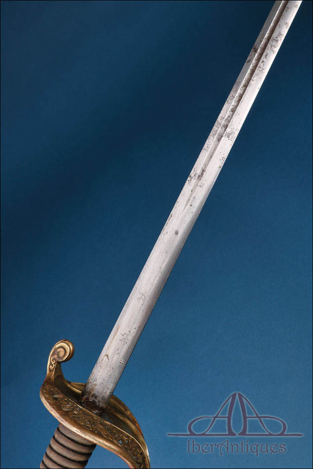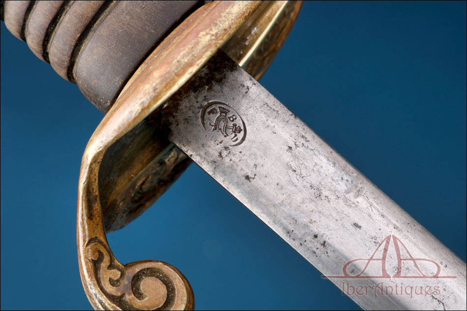 La empuñadura está realizada en latón dorado con guardamano envolvente de perfil curvado y remate en voluta, elemento característico de este modelo. Presenta decoración grabada de carácter vegetal y ornamental tanto en la guarda como en el pomo, visible en distintos detalles del conjunto. La hoja es recta, de sección sólida y bien definida, con canal longitudinal que aligera el peso y mejora su resistencia estructural. Cerca de la base se aprecia claramente el punzón de fabricante, representado por un casco con penacho rodeado de las letras FDB, correspondiente quizás, sin poder asegurarlo del todo, a la casa François Delacour & Backes, armero o espadero parisino del siglo XIX. La superficie presenta pátina homogénea y zonas de oxidación propias del paso del tiempo, que podrían limpiarse si se desea mejorar su aspecto sin comprometer su autenticidad histórica.