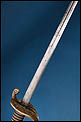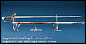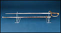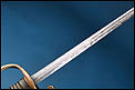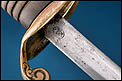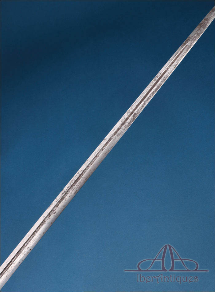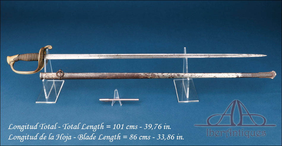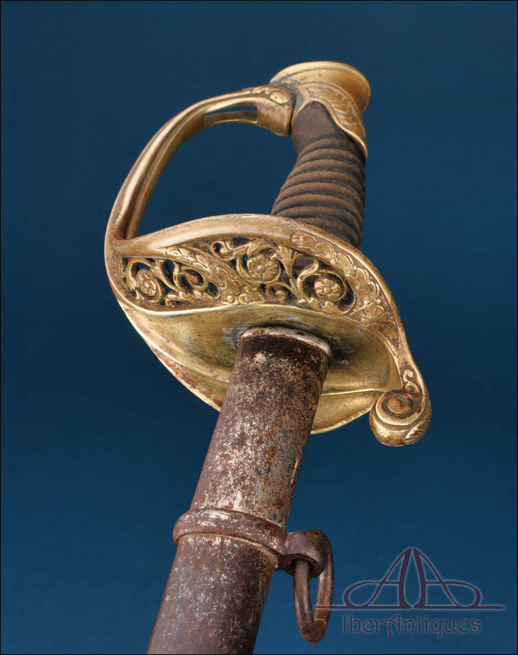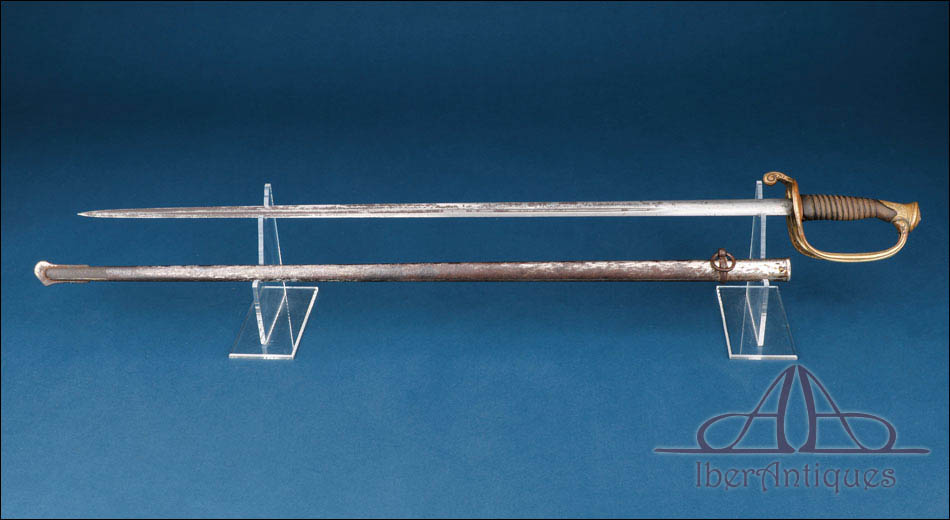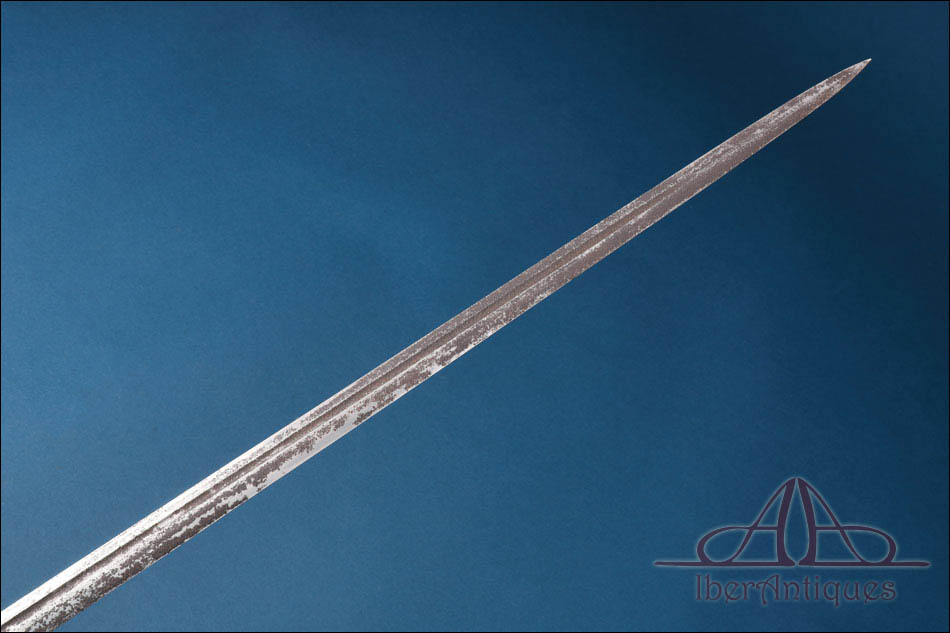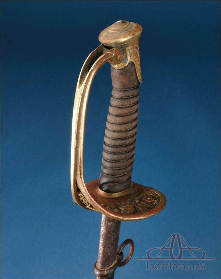 La empuñadura está realizada en latón dorado con guardamano envolvente de perfil curvado y remate en voluta, elemento característico de este modelo. Presenta decoración grabada de carácter vegetal y ornamental tanto en la guarda como en el pomo, visible en distintos detalles del conjunto. La hoja es recta, de sección sólida y bien definida, con canal longitudinal que aligera el peso y mejora su resistencia estructural. Cerca de la base se aprecia claramente el punzón de fabricante, representado por un casco con penacho rodeado de las letras FDB, correspondiente quizás, sin poder asegurarlo del todo, a la casa François Delacour & Backes, armero o espadero parisino del siglo XIX. La superficie presenta pátina homogénea y zonas de oxidación propias del paso del tiempo, que podrían limpiarse si se desea mejorar su aspecto sin comprometer su autenticidad histórica.