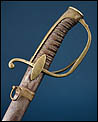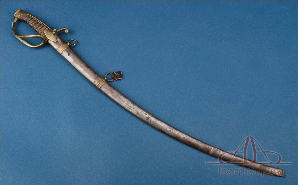La montura está realizada en latón con guardamano envolvente de perfil elegante, siguiendo fielmente la estética del modelo original de caballería ligera. La empuñadura es de madera con torzal metálico enrollado, conservando su configuración estructural y mostrando un desgaste coherente con la antigüedad de la pieza. Se aprecia la falta de una de las ramas de la guarda, defecto visible que no compromete la estabilidad general pero que forma parte de su estado real de conservación.