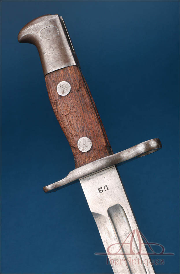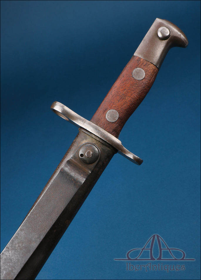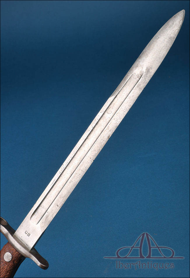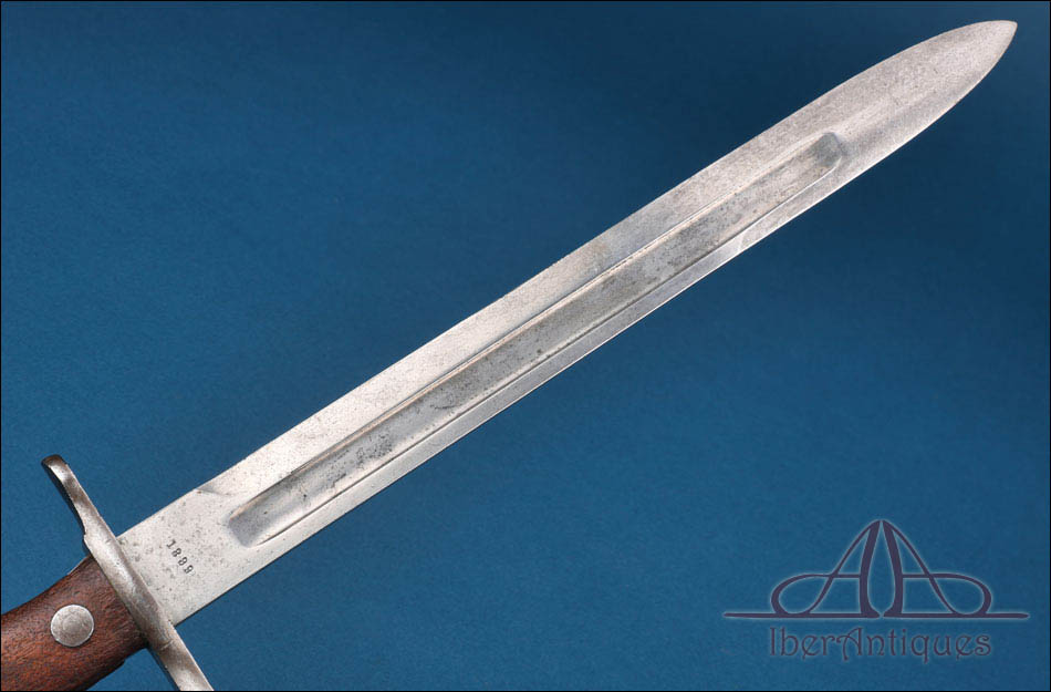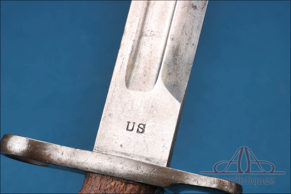 La empuñadura presenta cachas de madera fijadas mediante dos remaches metálicos visibles, con un desgaste homogéneo propio del uso y del paso del tiempo. El pomo incorpora el mecanismo de enganche reglamentario en buen estado de funcionamiento. La hoja es recta, de un solo filo, con un amplio vaciado longitudinal en ambas caras que aligera visualmente el conjunto y responde a criterios técnicos propios de este tipo de arma blanca militar. En la superficie de la hoja se conservan claramente visibles los marcajes “US” en un lado y la fecha “1899” en el otro, elementos que aportan autenticidad y refuerzan su interés histórico.