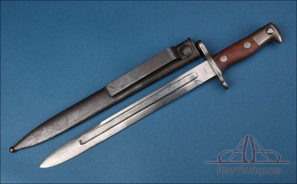 Antigua bayoneta reglamentaria estadounidense modelo 1892, diseñada para el fusil Krag-Jørgensen y fechada en la hoja en 1899. Se trata de una pieza muy representativa del armamento militar norteamericano de finales del siglo XIX. Está completa y en muy buen estado, con su vaina original con suspensor.