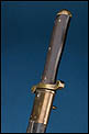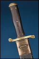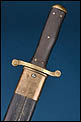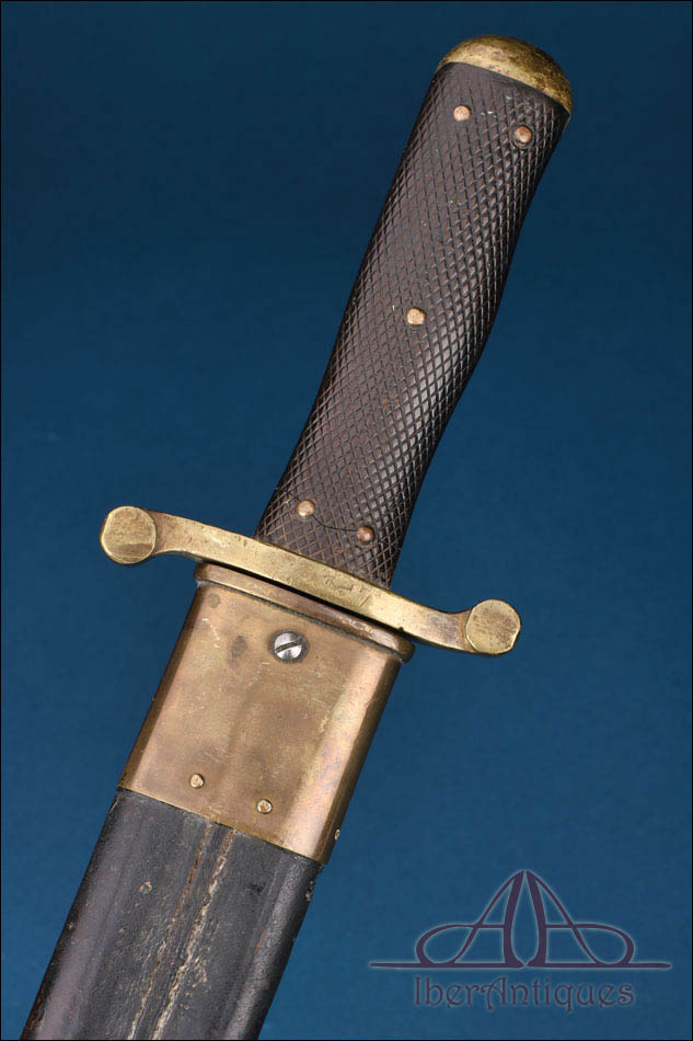 Antiguo machete reglamentario de zapador suizo modelo 1878, pieza militar de finales del siglo XIX. Se trata de un ejemplar representativo del equipamiento de ingenieros militares, concebido tanto para trabajos de campaña como para uso táctico. La empuñadura presenta cachas cuadriculadas y fijadas mediante remaches de latón que refuerzan la solidez del conjunto. El pomo y las guarniciones están realizados en latón, material que aporta contraste visual y resistencia estructural. La cruceta adopta una característica forma en S.