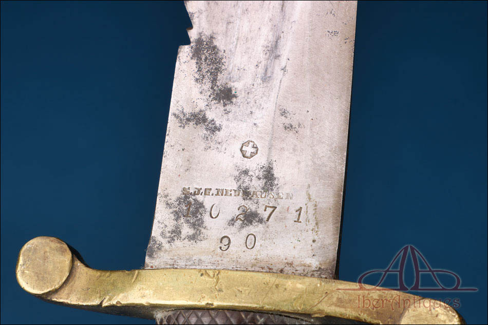 La hoja es recta y de gran tamaño, con vaceos longitudinales que aligeran su peso sin comprometer su resistencia. En el lomo se disponen dientes de sierra pronunciados, propios de los machetes de zapador destinados a tareas de desbroce o trabajos de ingeniería en campaña. Se conservan visibles los marcajes con la cruz helvética, así como la firma del fabricante S.J.G. Neuhausen y la numeración reglamentaria, elementos que refuerzan la autenticidad del ejemplar. La superficie de la hoja presenta pátina, manchas y desgaste superficial propios del uso y del paso del tiempo.