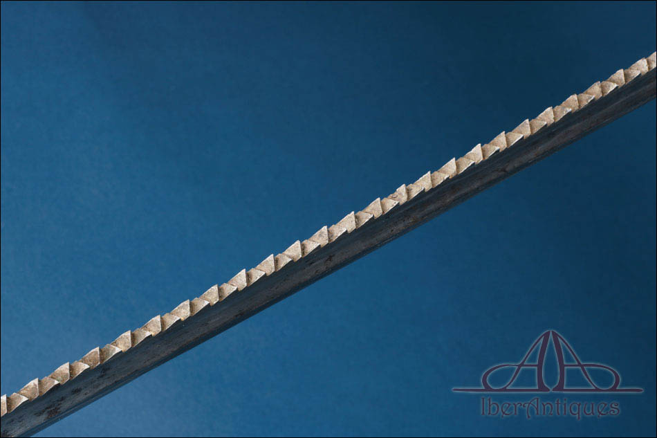 Uno de los rasgos más característicos de muchos machetes de zapador es la presencia de dientes de sierra en el lomo de la hoja. Esta sierra permitía cortar ramas, pequeños troncos o elementos de madera necesarios para la construcción de parapetos, empalizadas o estructuras provisionales. Además, resultaba útil para la apertura de caminos en terrenos boscosos o de vegetación densa, una tarea frecuente en operaciones militares. La integración de esta sierra en la propia hoja respondía a la necesidad de reducir el número de herramientas que debía transportar el soldado, concentrando varias funciones en un solo instrumento.