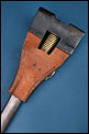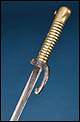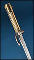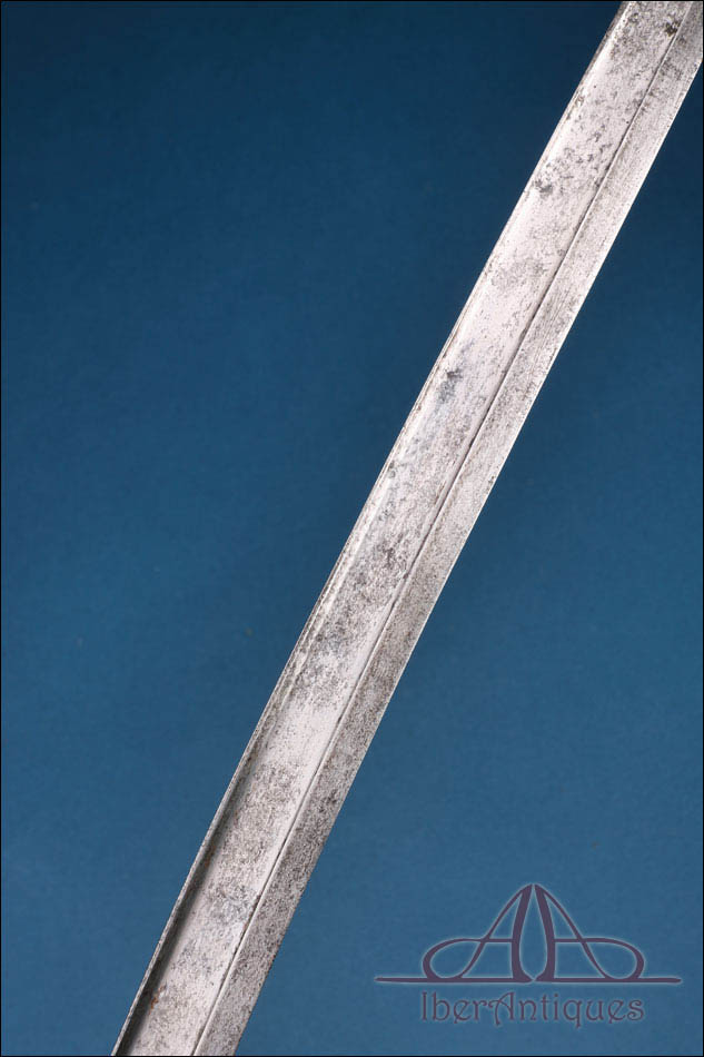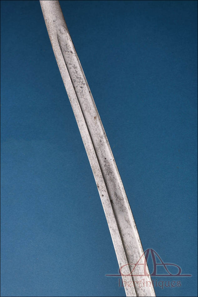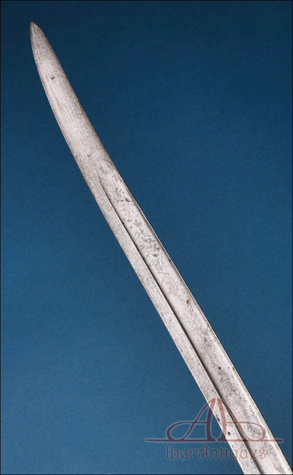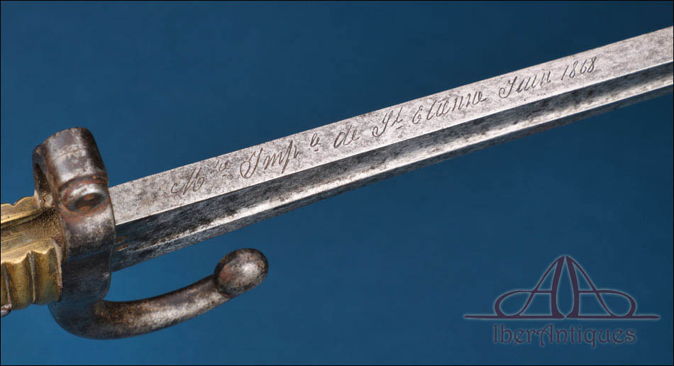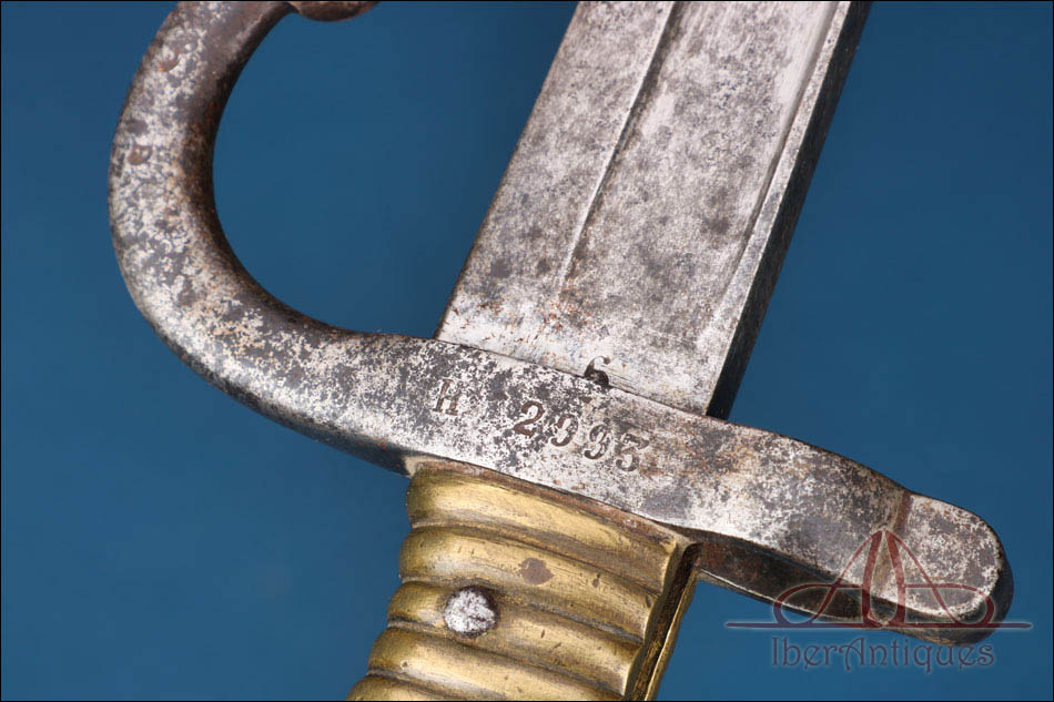 La empuñadura está realizada en latón macizo con acanaladuras longitudinales que facilitan el agarre. Conserva el sistema de fijación original con resorte funcional visible en el dorso, propio del diseño reglamentario. La guarda y el aro de enganche presentan pátina uniforme y oxidación superficial coherente con la antigüedad del conjunto. Estas señales de tiempo no afectan a la estabilidad estructural de la pieza y pueden ser limpiadas si se desea, aunque muchos coleccionistas prefieren mantener esta pátina original como garantía de autenticidad.