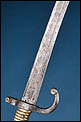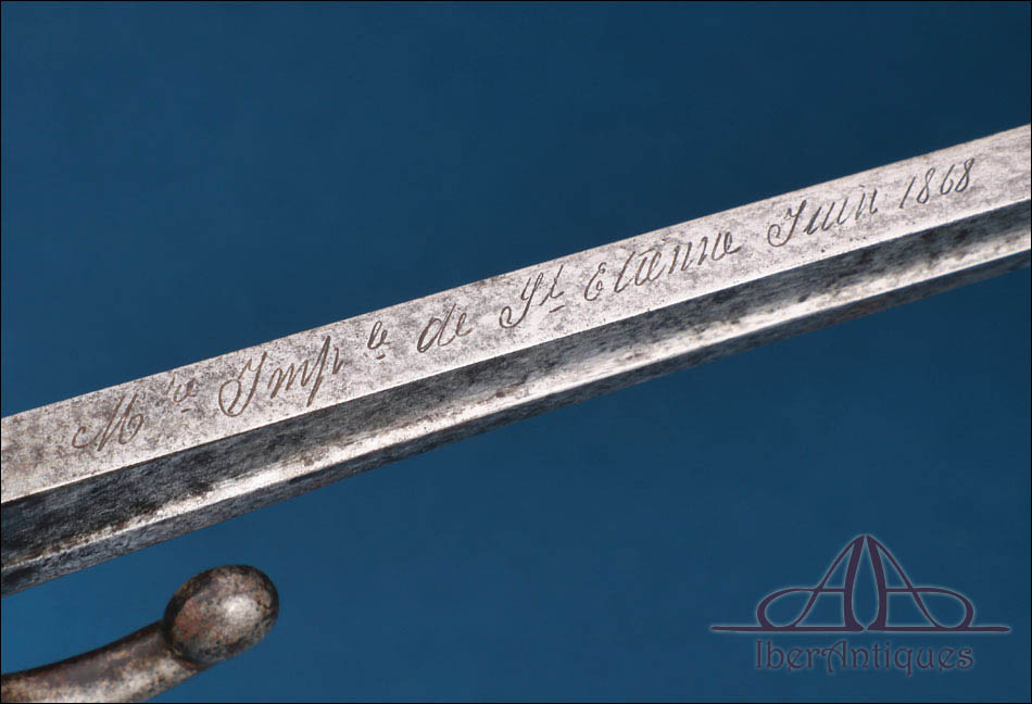 La hoja, de acero, presenta el característico perfil curvo tipo yatagán, con canal central longitudinal. La superficie muestra oxidación homogénea y marcas de uso propias del servicio, sin evidencias de manipulaciones modernas agresivas. En el lomo se conserva la inscripción reglamentaria de fabricación correspondiente a la manufactura imperial de Saint-Étienne con fecha de junio de 1868, dato especialmente relevante para la correcta datación histórica del sable.