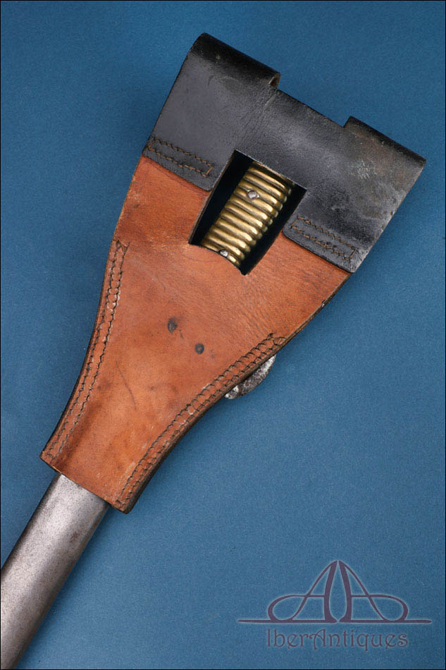 El conjunto se acompaña de su vaina original metálica, así como de un tahalí de cuero que permite su suspensión. El tahalí se conserva en muy buen estado general, con cuero flexible y costuras firmes, constituyendo un complemento poco frecuente cuando se conserva junto al arma. Este elemento añade interés coleccionista al conjunto al mantener la funcionalidad completa del equipo reglamentario.