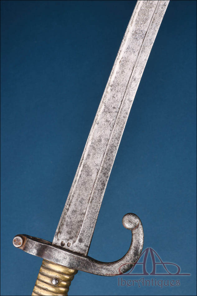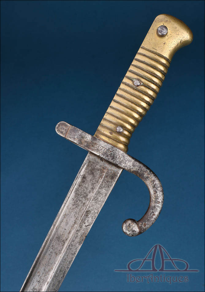 Antiguo sable bayoneta francés correspondiente al modelo Chassepot 1866, fabricado en la Manufactura Imperial de Saint-Étienne y fechado en junio de 1868. Se trata de una pieza reglamentaria del Segundo Imperio francés, asociada al fusil Chassepot, uno de los sistemas de armamento más importantes de la segunda mitad del siglo XIX. La hoja de perfil yatagán, característica de este modelo, confiere al conjunto una silueta reconocible dentro del armamento europeo de la época.