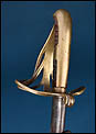 La guarnición es de latón y presenta aro envolvente con tres ramas curvas, monterilla prolongada y puño de madera forrado en cuero con estriado longitudinal. Este conjunto muestra una morfología muy próxima a la tradición española de caballería ligera, aunque ciertos detalles constructivos permiten considerar una posible fabricación alemana o al menos una influencia germánica. La forma del guardamano, la continuidad de la monterilla y la presencia de pequeñas lengüetas de latón en la empuñadura recuerdan a los modelos de fabricación alemana del período.