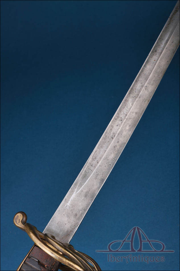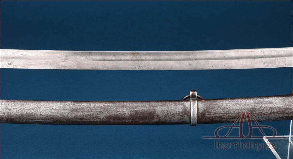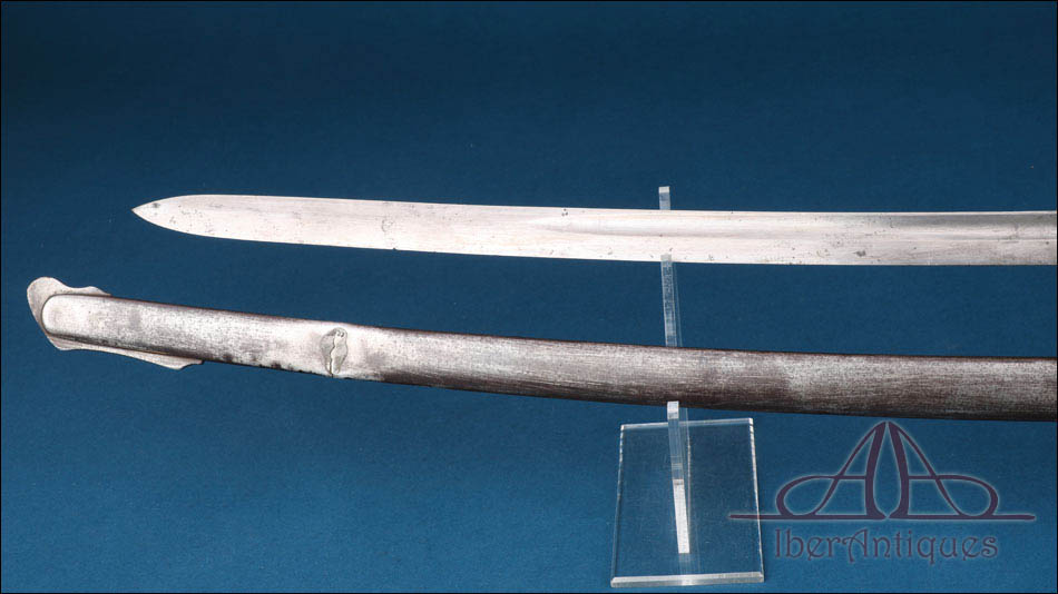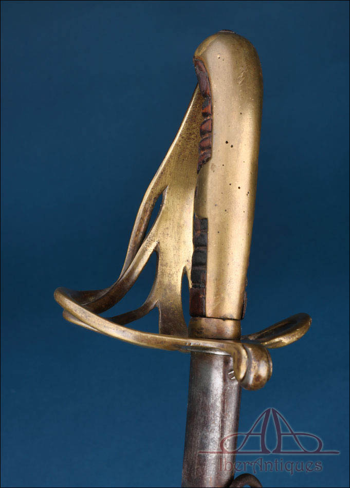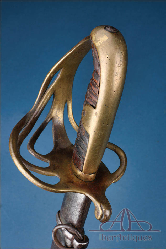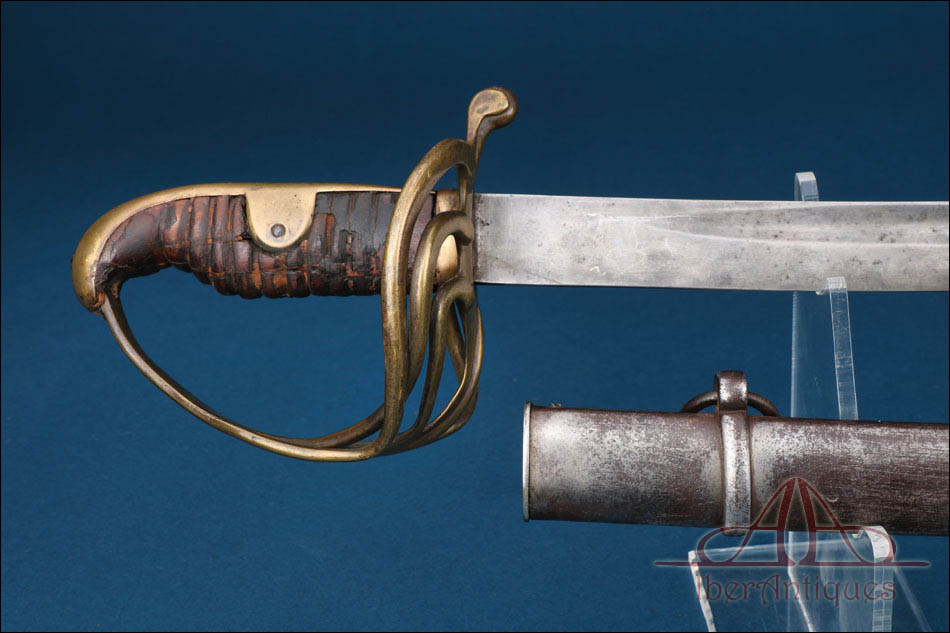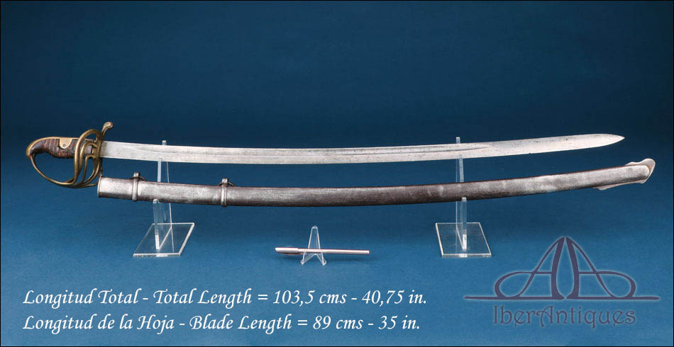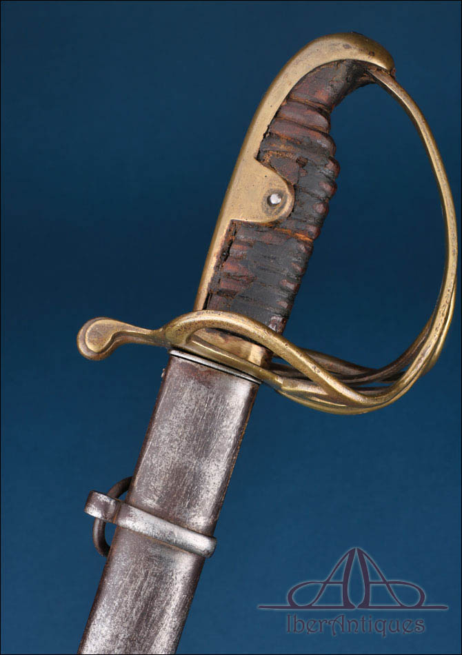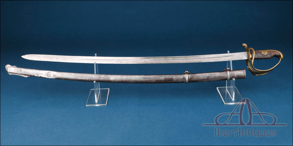 Antiguo sable europeo de caballería ligera de la primera mitad del siglo XIX, pieza auténtica de uso militar cuya tipología se relaciona claramente con los modelos españoles reglamentarios de 1815 y 1822. Su configuración responde al patrón clásico de los sables destinados a la caballería ligera de principios del siglo XIX, con hoja curva de un solo filo y guarnición abierta concebida para proteger la mano sin añadir peso excesivo.