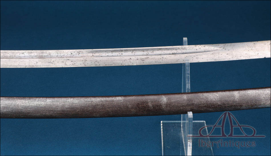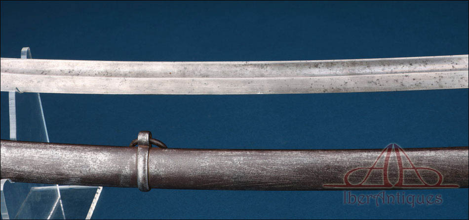 La hoja es larga, curva y bien proporcionada, adecuada para el uso desde montura. Presenta pátina homogénea, desgaste superficial y manchas propias del paso del tiempo, sin apreciarse marcas visibles en las zonas documentadas. Estas características son habituales en armas militares auténticas con uso real y coherentes con su cronología.