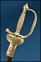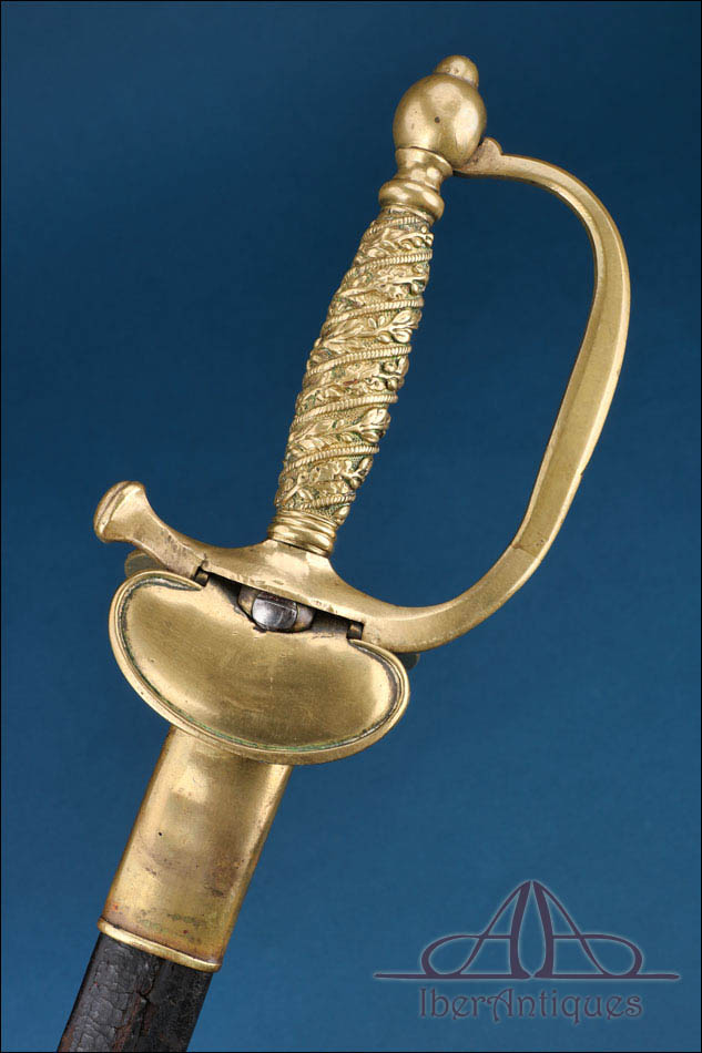 La montura está realizada en broce o latón, con empuñadura moldeada y decorada mediante guirnaldas vegetales en relieve, característica de este tipo de espadas francesas del siglo XIX. El pomo presenta forma de oliva, sobrio y bien proporcionado. El guardamano, de una sola rama, ofrece una protección sencilla y eficaz, manteniendo una línea limpia en el conjunto. Incorpora contra-clavier posterior abatible según el sistema reglamentario francés tipo Manceaux, elemento práctico que facilitaba el porte en servicio y que confirma su uso real dentro del ámbito militar.