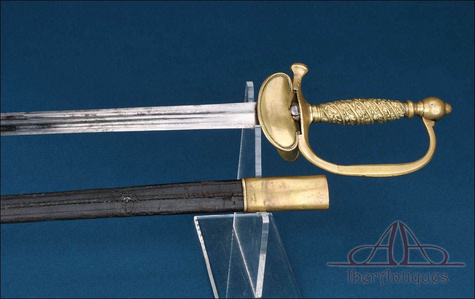 La espada conserva su vaina original con guarniciones metálicas y el tahalí de cuero reglamentario. La vaina muestra desgaste exterior, con marcas de uso y envejecimiento visibles, mientras que el latón presenta una pátina natural homogénea. El cuero del tahalí mantiene su estructura, con señales normales de uso y costuras visibles. Todo el conjunto resulta coherente y completo, algo cada vez menos habitual en este tipo de piezas.
