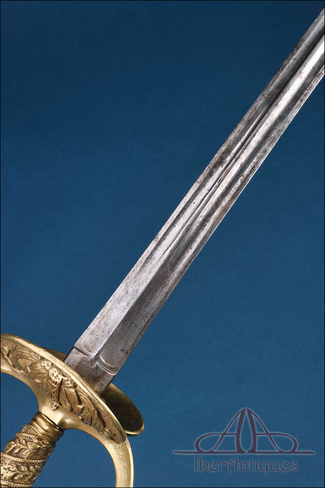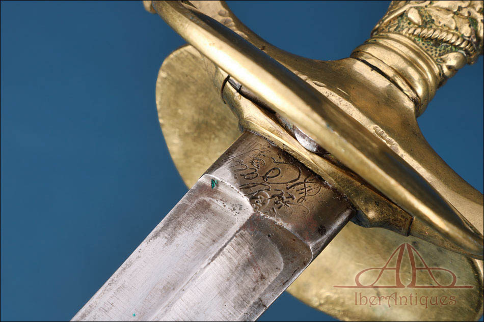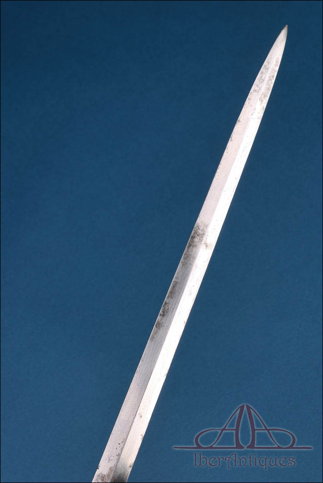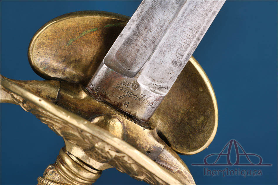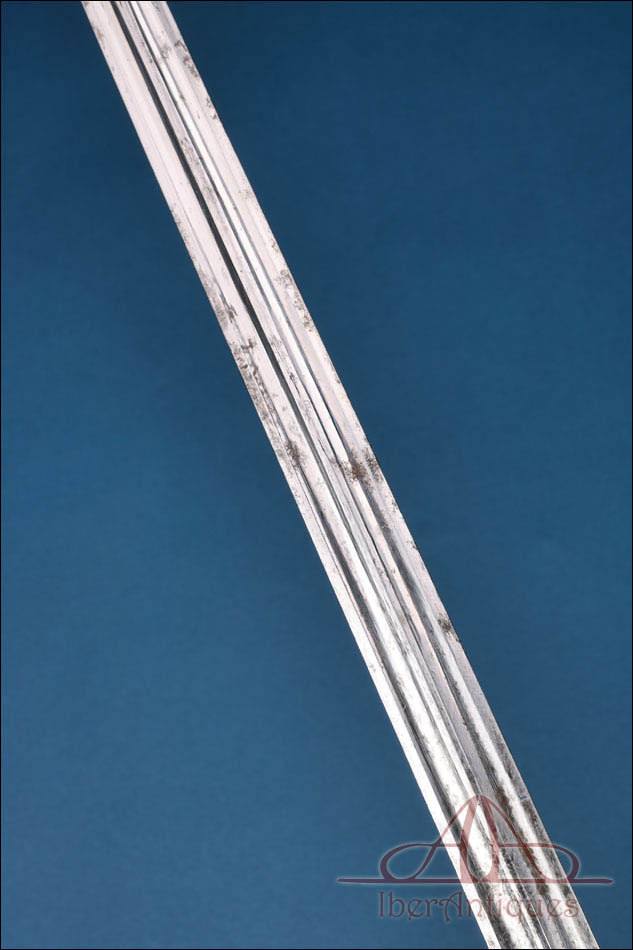 El clavier, de forma reniforme, presenta como motivo central el haz de lictores sobre fondo de banderas, emblema vinculado a la justicia militar francesa. Este detalle es clave para identificar su función dentro de los servicios jurídicos o disciplinarios del ejército o la gendarmería. La hoja es recta, de sección sólida, con doble canal longitudinal en su primer tramo. Se conserva bien alineada, con desgaste superficial y pequeñas manchas propias de su antigüedad, sin deformaciones ni pérdidas estructurales. Los marcajes son legibles y aportan un valor añadido al conjunto.
