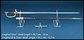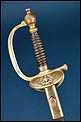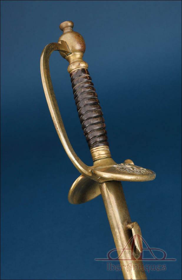 La montura está realizada en latón dorado y presenta una construcción sólida y equilibrada. El guardamano se compone de una única rama curvada que enlaza el pomo con la parte delantera de la guarda, generando una silueta. El pomo es globular o con forma de oliva con pequeño botón terminal. El puño está realizado en madera oscura tallado en gallones transversales.
