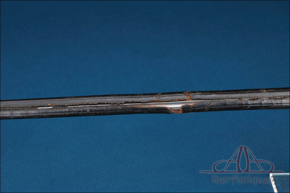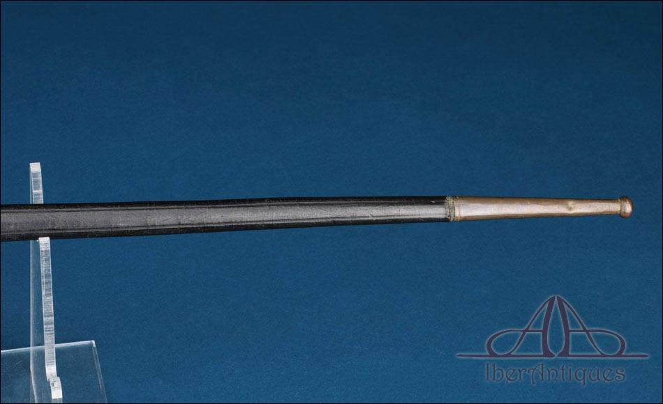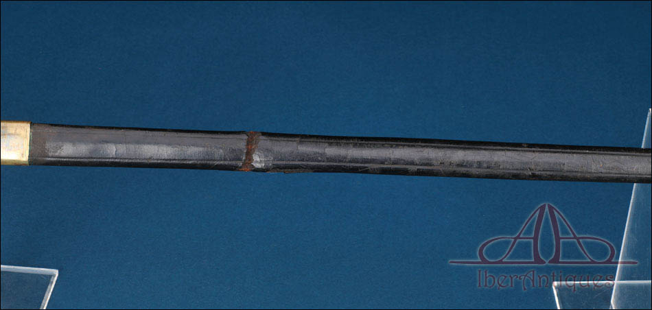 La espada conserva su vaina original de cuero negro, con guarniciones de latón dorado en la embocadura y en el extremo inferior. El cuero presenta desgaste y apertura longitudinal en la parte posterior, fenómeno habitual en este tipo de vainas antiguas, manteniendo sin embargo su integridad estructural y coherencia estética con el arma.