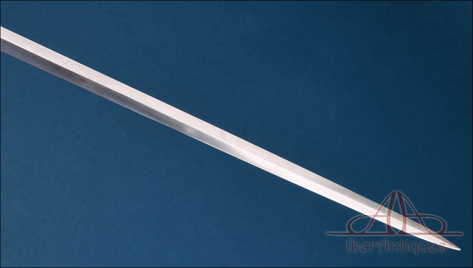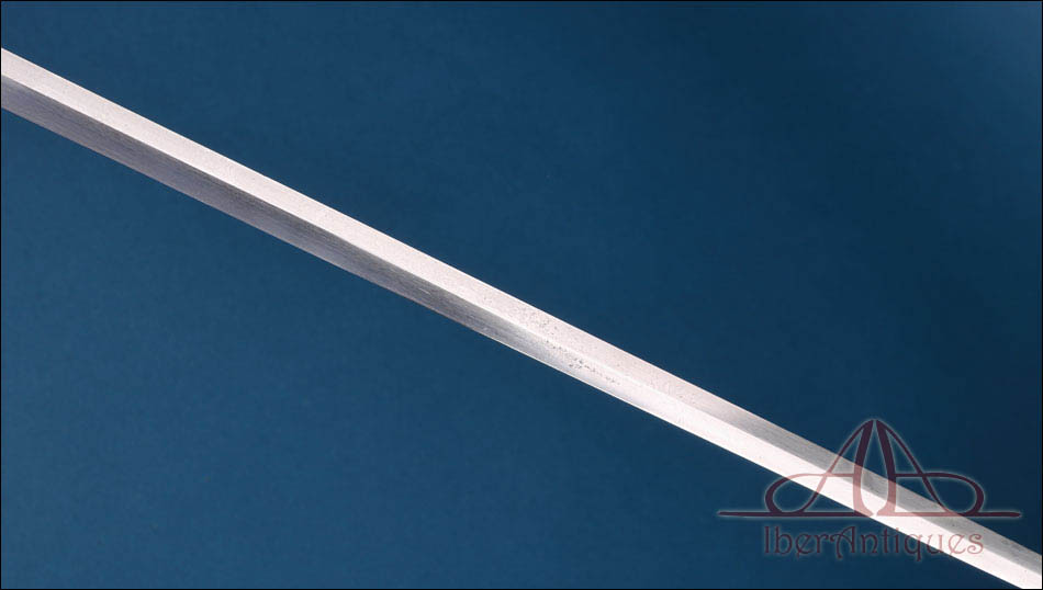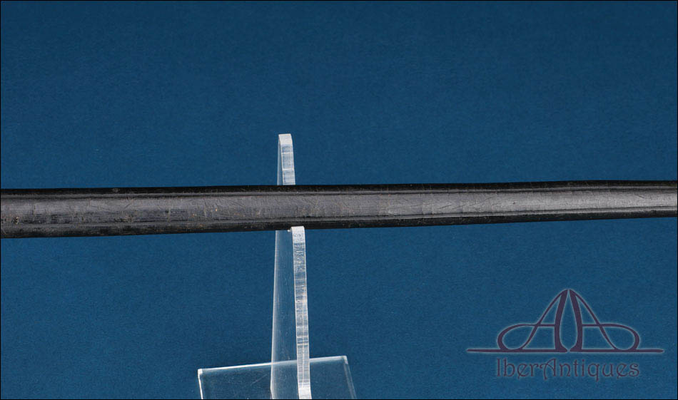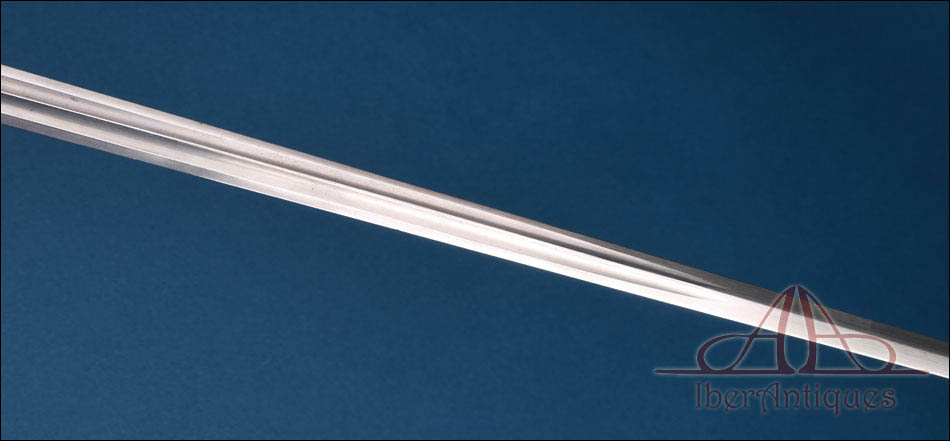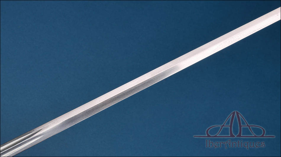 La hoja es recta, estrecha y alargada, con doble acanaladura longitudinal en buena parte de su recorrido. Responde a una tipología ligera concebida principalmente para uso institucional y representativo. Conserva buena alineación general, con desgaste superficial y señales normales de antigüedad. La punta se mantiene bien definida. En la base se aprecian marcajes correspondientes a Coulaux & Cie y a la Manufacture de Klingenthal, lo que confirma su fabricación dentro del ámbito reglamentario francés.